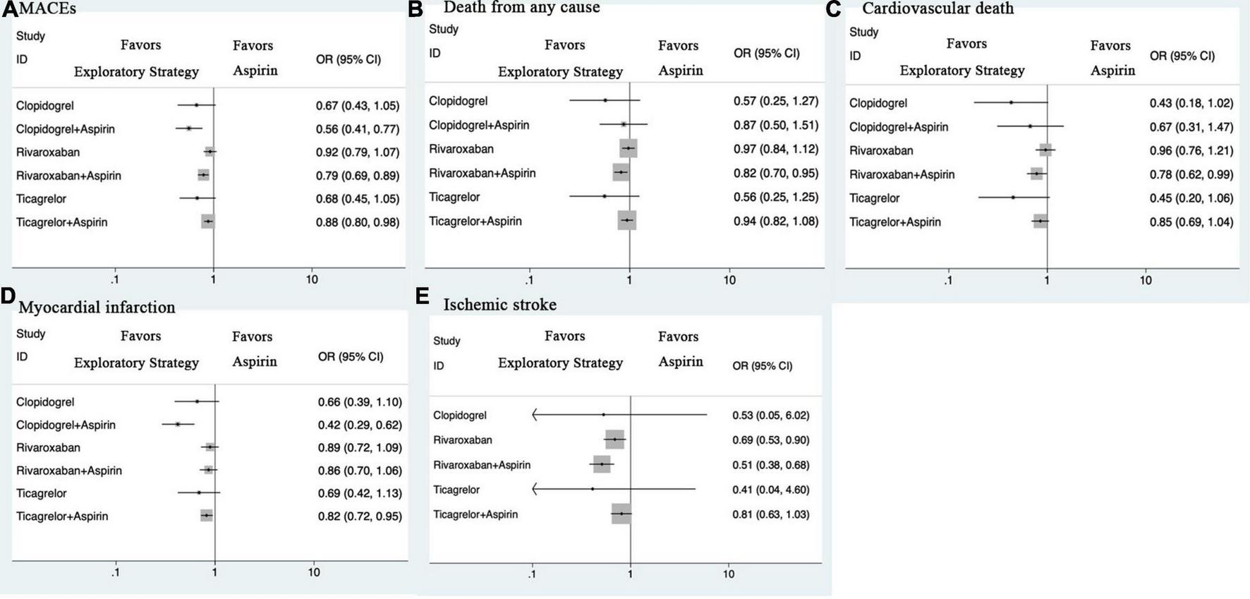 Compared with aspirin monotherapy, rivaroxaban plus aspirin was associated with a reduced risk of all-cause death (Figure 2 and Supplementary Table 6). Compared with rivaroxaban monotherapy, rivaroxaban plus aspirin was associated with a reduced risk of all-cause death. Compared with aspirin monotherapy, rivaroxaban plus aspirin was associated with a reduced risk of cardiovascular death. Compared with aspirin monotherapy, ticagrelor plus aspirin and clopidogrel plus aspirin were associated with a reduced risk of MI. Compared with rivaroxaban monotherapy, rivaroxaban plus aspirin, ticagrelor plus aspirin, and clopidogrel plus aspirin were associated with a reduced risk of MI. Compared with aspirin monotherapy, rivaroxaban monotherapy, rivaroxaban plus aspirin, and ticagrelor plus aspirin were associated with a reduced risk of ischemic stroke.