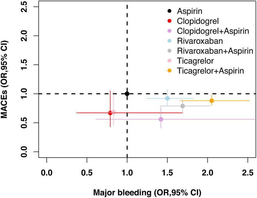 Net clinical benefit. OR of different antithrombotic strategies in comparison with aspirin (reference) and associated 95% CI are plotted. Major bleeding is on the x-axis and MACEs is on the y-axis. CI, credible intervals; MACEs, major adverse cardiovascular and cerebrovascular events; OR, odds ratio.