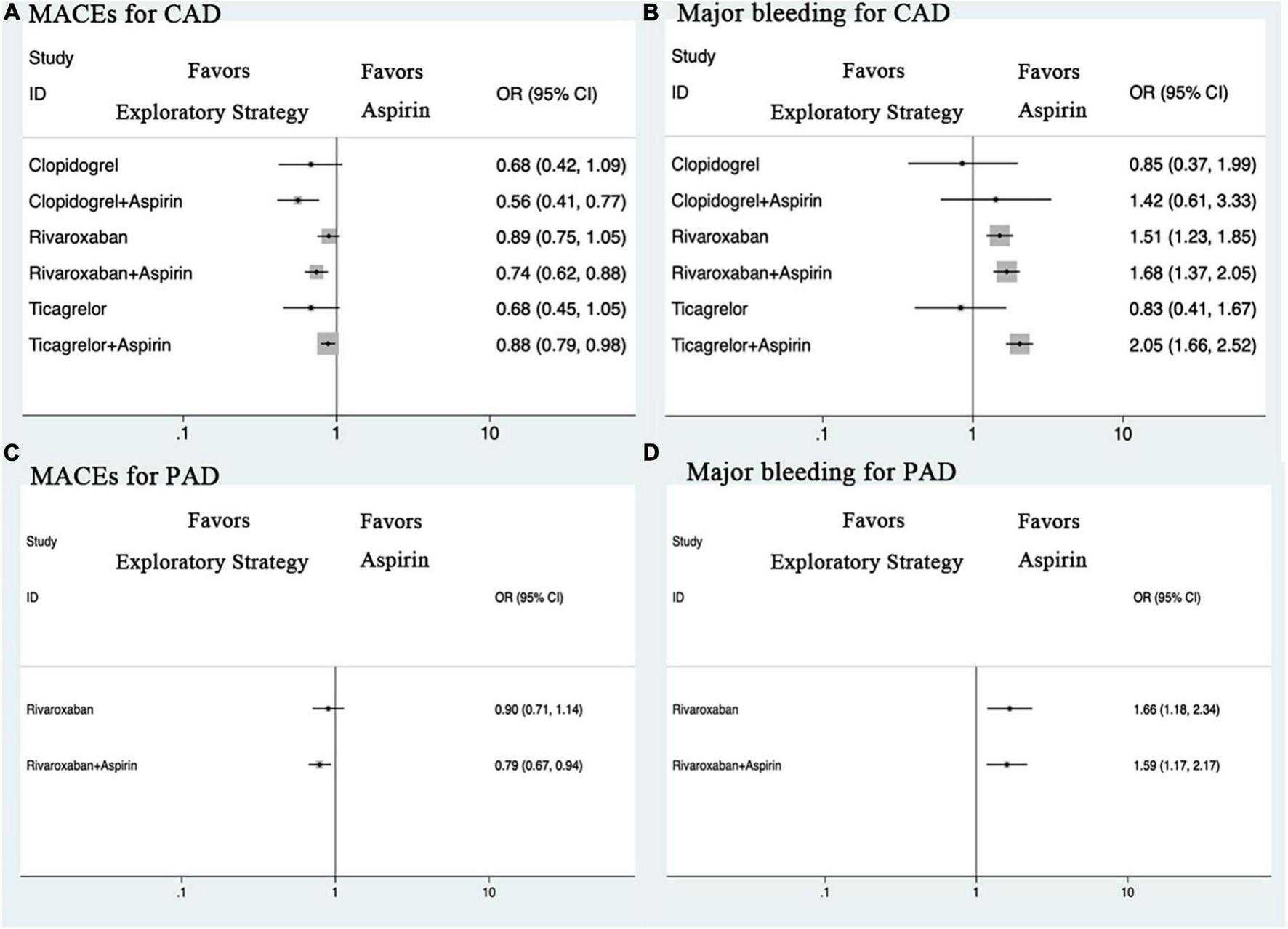 Forest plots for outcomes in patients with CAD or PAD. (A) MACEs for CAD. (B) Major bleeding for CAD. (C) MACEs for PAD. (D) Major bleeding for PAD. CAD, coronary artery disease; CI, credible intervals; MACEs, major adverse cardiovascular and cerebrovascular events; OR, odds ratio; PAD, peripheral artery disease.