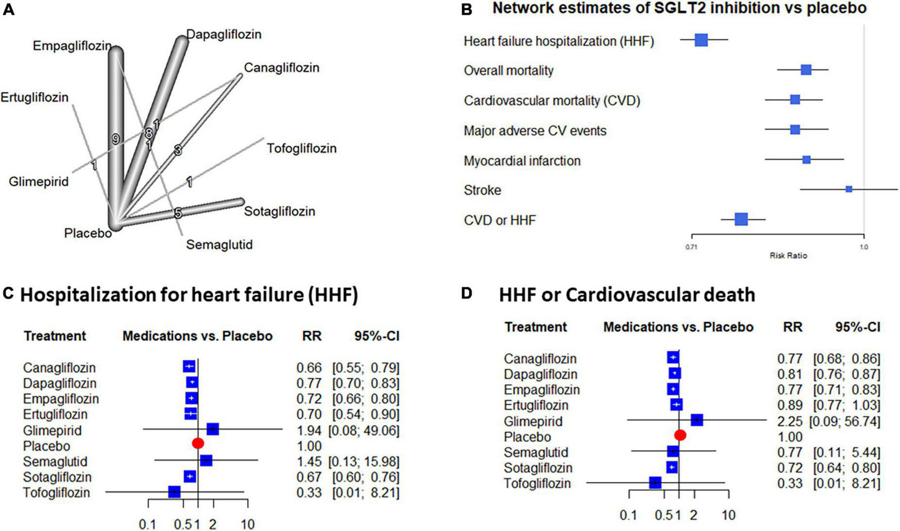 Evidence network and network estimates of the placebo compared effects: The network graph shows the individual treatment arms of the included trials depicting treatments as nodes and direct comparisons as edges. The numbers and the thickness of the edges show the direct comparisons performed (A). (B) Depicts the estimates of gliflozin treatment compared to placebo extracted from the random effects network. (C,D) Show forest plots of heart failure hospitalization (HHF) and the HHF + cardiovascular mortality (CVD) endpoints. The relative risk (RR) values are presented as squares with whiskers showing their 95% confidence interval.