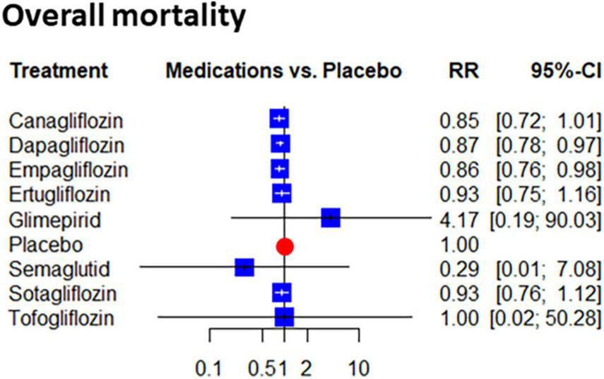 Network estimates of placebo compared effect on the risk of the overall mortality: Forest plots show the relative risk (RR) values and their 95% confidence intervals of individual treatments as estimated on mortality.