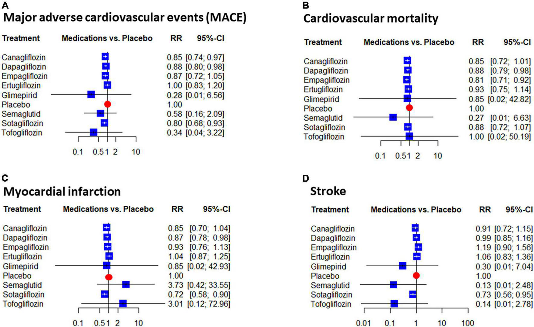 Network estimates of placebo compared the effect on the risk of major adverse cardiovascular events (MACE): Forest plots show the relative risk (RR) values and their 95% confidence intervals of individual treatments as estimated on MACE (A) and its components: Cardiovascular mortality (B), myocardial infarction (C), stroke (D).