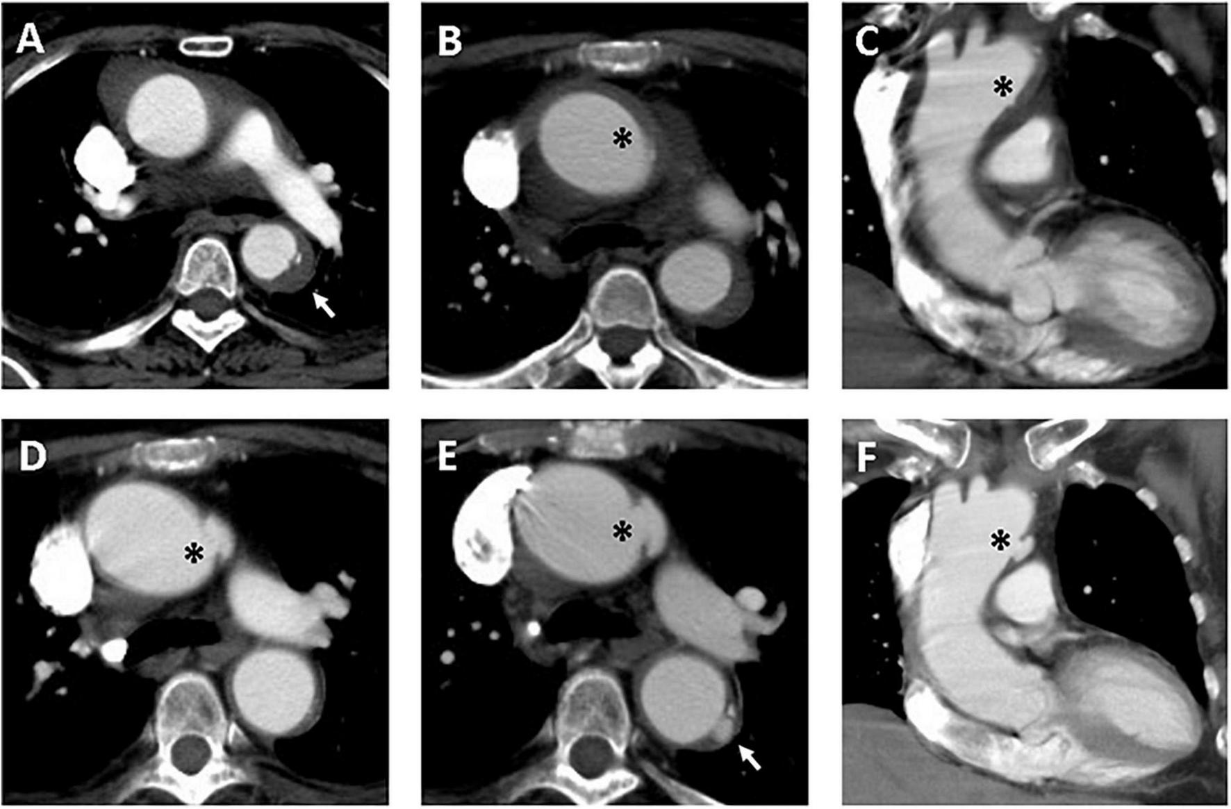 Serial CT scans showed progression of PAU and ULP in a 69-year-old woman with TAIMH. Contrast-enhanced CT scan showed TAIMH with PAU (arrow) in the proximal descending aorta (A) and ULP (asterisk) in the proximal aortic arch (B,C). Three months later, the follow-up CT scan showed enlarged ULP (D, asterisk). The PAU (arrow) in the proximal descending aorta and ULP (asterisk) in the proximal aortic arch were slowly progressed in overall size on 14-month follow-up CT scan (E,F). The patient received medical treatment alone and was still alive.