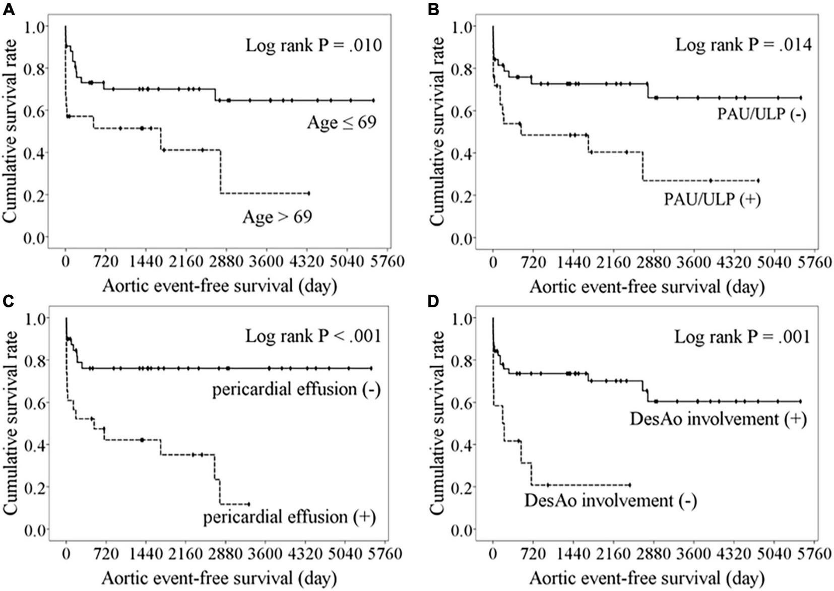 Kaplan–Meier analysis of freedom from aortic events comparing with the variables. Lower aortic event-free survival were observed in patients with aged over 69 years (A), the presence of PAU or ULP (B), pericardial effusion (C), or absence of descending aorta involvement (D).