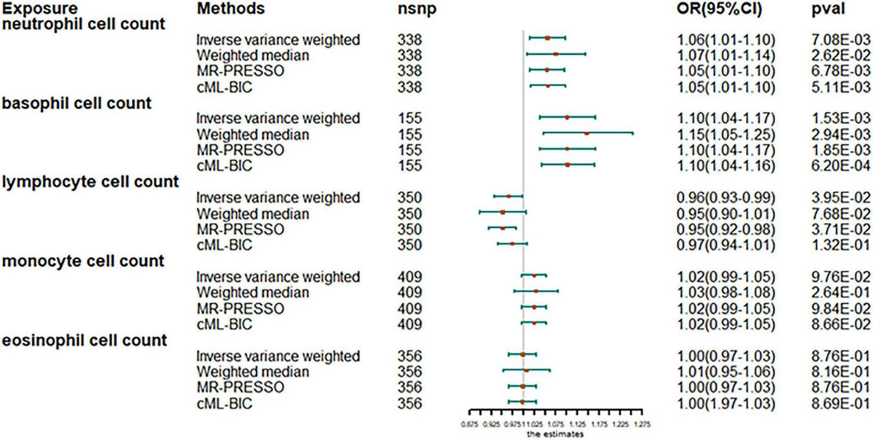 The analysis after evaluation and removal of SNPs associated with confounding is shown in Figure 1. Since no significant heterogeneity was observed in the Cochran Q test, a fixed-effects model was used to estimate MR effect sizes. IVW (fixed effects) analysis showed that higher neutrophil counts were strongly associated with an increased susceptibility to AF [odds ratio (OR), 1.06; 95% confidence interval (CI), 1.01–1.10; P = 0.0070]. In addition, basophil counts were also observed to be associated with an increased susceptibility to AF in other leukocyte subtypes (OR, 1.10; 95% CI, 1.04–1.17; P = 0.0018). However, lymphocyte count was inversely associated with disease risk (OR, 0.97; 95% CI, 0.93–0.99; P = 0.0481), thus, suggesting the protective role of lymphocytes in AF. Sensitivity analyses showed no genetic polymorphism bias in any of the genetically predicted immune cell count analyses. LOO analysis further showed that the significance of the results was not driven by any single SNP. No obvious horizontal polytropism was found by visual inspection of funnel plots and analysis of MR-Egger regression intercepts. The results of the heterogeneity test, the polytropy test and the F-statistic are summarized in Supplementary Table 7. However, eosinophil or monocyte counts were not significantly associated with AF, although a positive trend was observed.