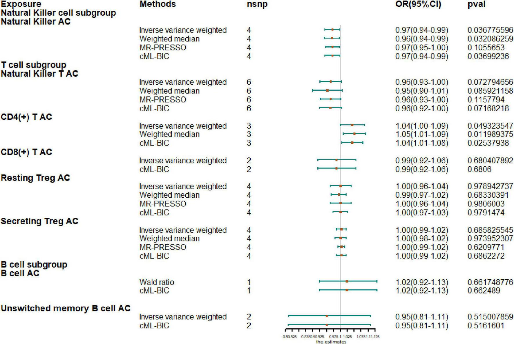 Next, we extended our analysis by further measuring causal estimates of the risk of AF by natural killer (NK), T and B cells in lymphocytes. Due to the small sample size of GWAS, we only evaluated eight lymphocyte subsets by MR, including NK cells, NKT cells, resting Tregs, secreting Tregs, CD4+ T cells, CD8+T cells, B cells, and unswitched memory B cells. If there were less than two IV variables available, Wald ratio results are shown instead of IVW and when there were fewer than three IVs, only IVW and CML-BIC are shown (Figure 2). Our analysis showed that increased CD4 + T-cell counts were associated with a higher risk of AF (OR, 1.04; 95% CI, 1.0–1.09; P = 0.0493). An increase of NK cell count was associated with a protective effect on AF (OR, 0.97; 95% CI, 0.94–0.99; P = 0.0368) and the NKT cell count was also negatively correlated with AF (OR, 0.96; 95% CI, 0.93–1.00; P = 0.0728), although the results were not significant. However, we also observed that genetically predicted increases in CD4 + T-cell counts were associated with a higher risk of AF (OR, 1.04; 95% CI, 1.0–1.09; P = 0.0493). In addition, due to the sample size, we did not observe a causal effect of other cell subtypes on AF risk and all results were supported by other MR methods.