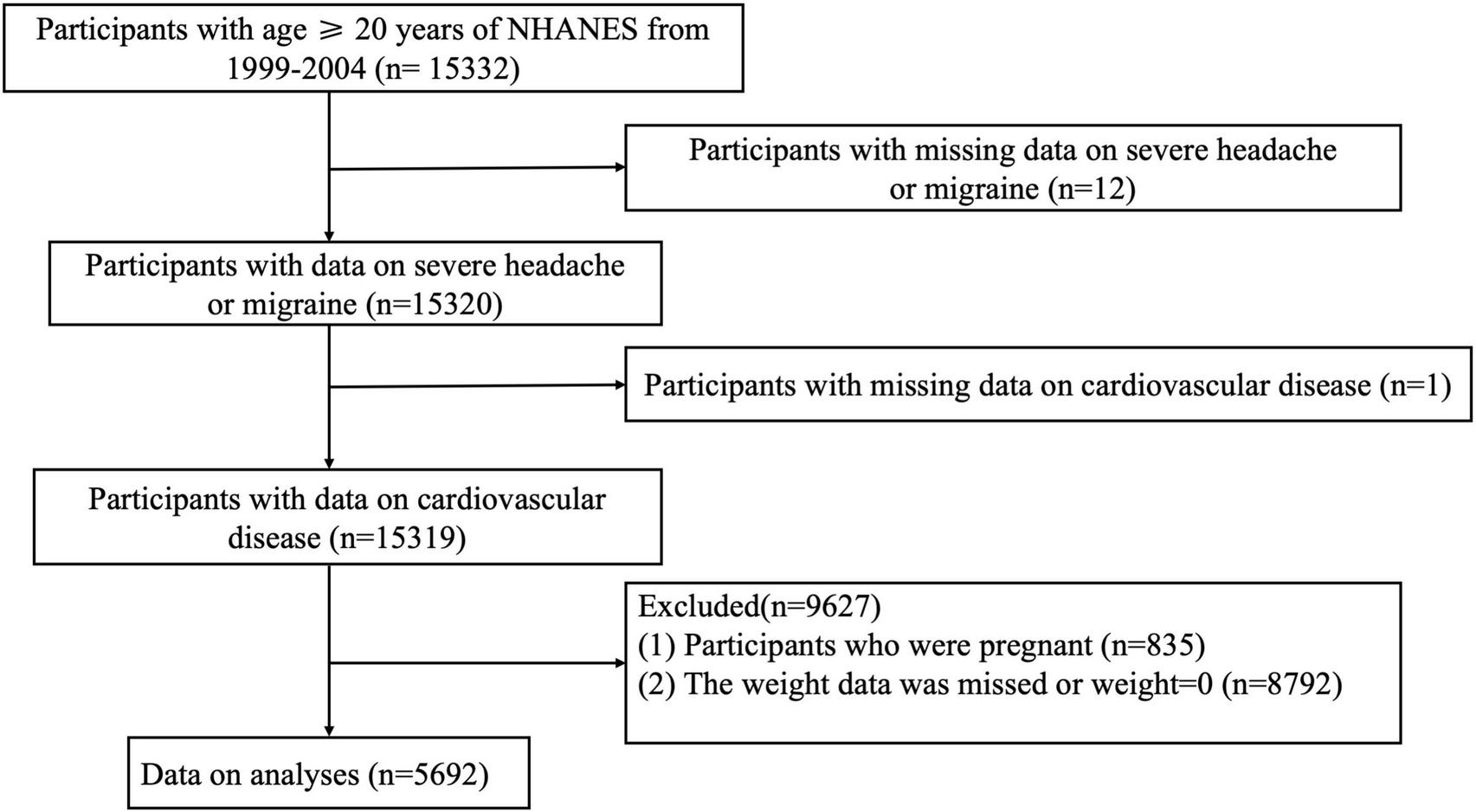 This article was based on publicly-available data from the NHANES. It is available on the Centers for Disease Control and Prevention National Center for Health Statistics1. Our study originally comprised subjects above 20 years with available data on migraine and CVD from the NHANES 1999–2004 (n = 15319). After excluding pregnant women (n = 835) and individuals with missing or invalid weight data (n = 8,792), 5,692 subjects were ultimately enrolled for further analyses. NHANES Institutional Review Board approved the ethical conduct of NHANES 1999–2004 (Protocol#98-12), and all participants provided informed consent. The study procedures were structured in line with the Declaration of Helsinki. Detailed information about subject recruitment is illustrated in Figure 1.