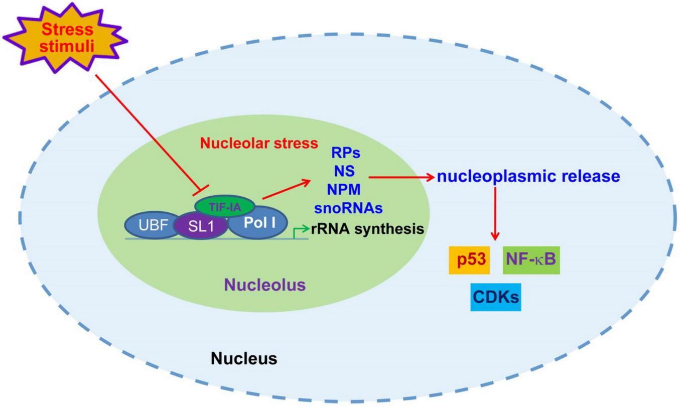 Nucleolar stress-initiated signaling transduction. Upon unfavorable stress stimuli, including DNA damages, nutrient deprivation, hypoxia and oxidative stress, the disruption of rRNA synthesis through posttranscriptional modification of Pol I transcriptional machinery components causes nucleolar malfunction and stress, leading to nucleoplasmic release of ribosomal proteins (RPs), NS, NPM and snoRNAs, and consequent modulation of p53, NF-κB and CDKs.