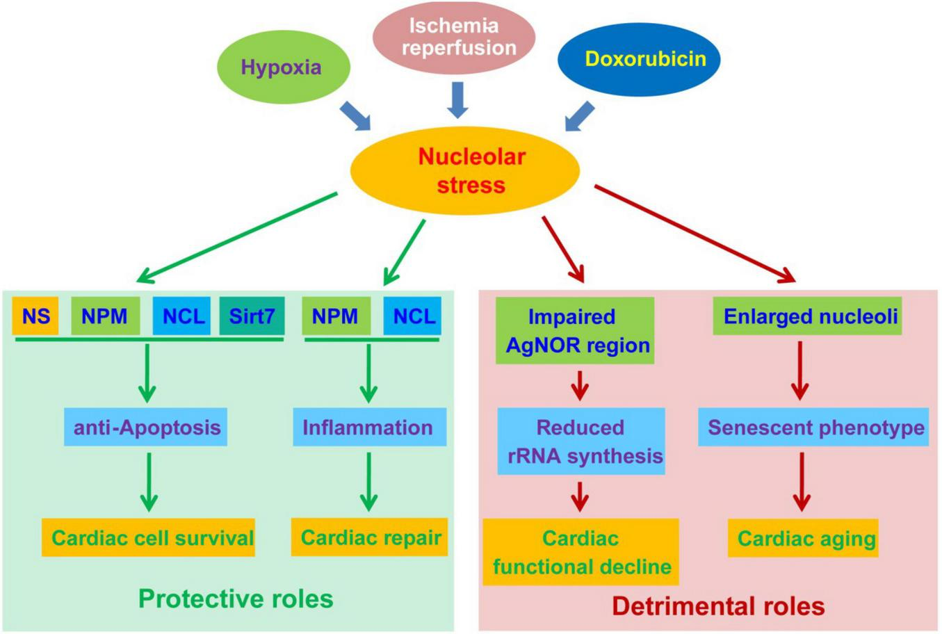 The protective and detrimental roles of nucleolar stress in cardiac disease progression. Nucleolar stress, as a result of hypoxia, ischemia-reperfusion (IR) and doxorubicin exposure, function as a double-edged sword in the development of cardiac diseases. On the one hand, nucleolar stress triggers the upregulation and altered distribution of cardioprotective nucleolar proteins. These proteins exert pro-survival functions in cardiomyocytes, and meanwhile activate inflammatory responses to promote cardiac repair. On the other hand, nucleolar stress may be associated with impaired rRNA transcription and enlarged nucleoli during the progression of cardiac diseases, leading to cardiac functional decline and aging.