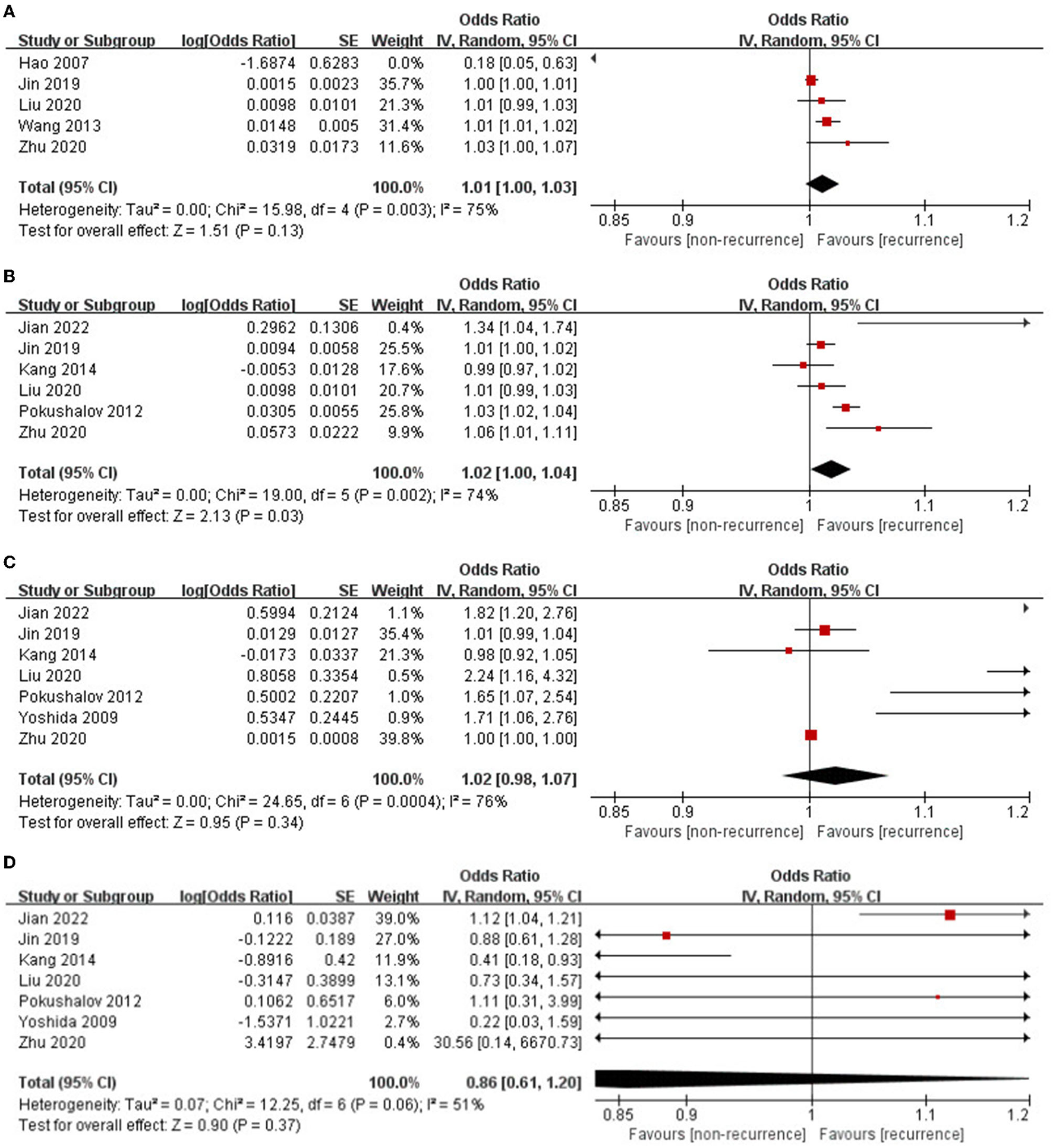 The pooled OR for SDNN in predicting AF recurrence after catheter ablation was 1.01 (95% CI: 1.00–1.03; p = 0.13, Figure 2A). All five researchers came from China. Significant heterogeneity existed among the enrolled researchers (I2 = 75%, P for Cochrane's Q-test = 0.003). Sensitivity analyses reached similar results. Subgroup analysis enrolled three studies of patients with purely paroxysmal AF, which showed that SDNN could independently predict AF recurrence (OR: 1.02, 95% CI: 1.01–1.02; p = 0.0006).
