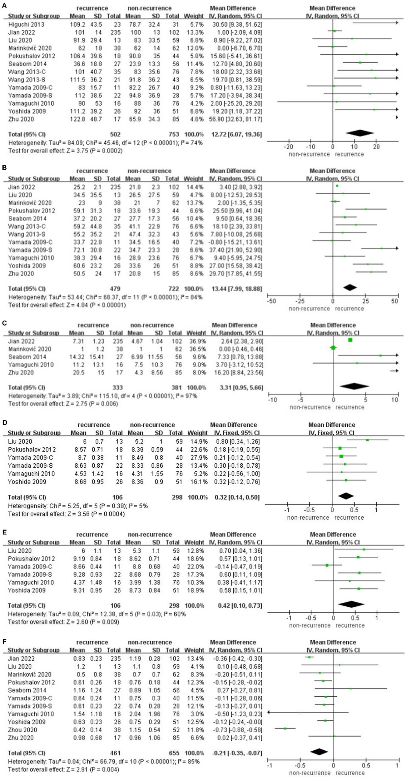 The clinical characteristics, design details, and HRV parameters of the enrolled studies are shown in Table 2. Overall, two (22, 23) of them were prospective studies, while the other three were retrospective cohorts. The sample sizes varied from 42 (16) to 614 (19). Of them, nine studies included paroxysmal AF (20, 22–24, 26, 28, 30–32), while the other two included both paroxysmal and persistent AF. Patients in all included research underwent pulmonary vein isolation [linear, triggers (28, 31), cavotricuspid isthmus (16, 25, 26, 30), mitral isthmus (26), complex fractionated atrial electrogram (21, 24, 30), superior vena cava (19, 26, 28, 31), ganglionated plexi (24) ablation, or BOX (29) if necessary] as the ablation strategy for AF. The follow-up duration varied between 6 (16) and 62 (26) months. The recurrence incidence rate varied between 13.3% (32) and 69.7% (18) (Table 3). The NOS of all enrolled articles ranged from seven to nine (Table 2), prompting good research quality.
