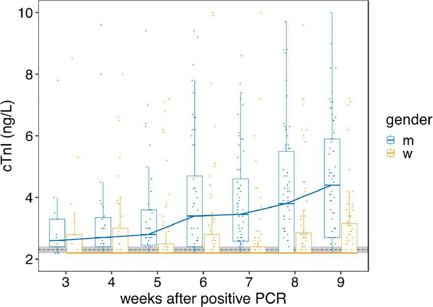 There is a known, stable gender-difference (25) in cTnI; however, this can not explain the significant increase observed during the first 9 weeks after SARS-CoV-2 infection in men older than 54 years. Also, renal and hepatic dysfunction (with potentially reduced troponin clearance) was ruled out. Thus, it seems that the significant increase in cTnI in the weeks after SARS-CoV-2 infection reflect mild, but ongoing myocardial damage secondary to the SARS-CoV-2 infection.