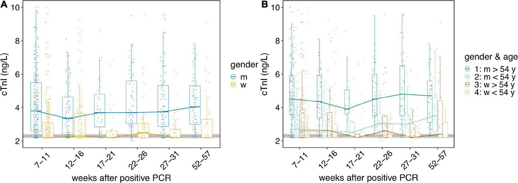 The course of hs troponin I concentrations over a period of more than 1 year. The course of hs troponin I concentrations (cTnI) over a period of more than 1 year [high sensitive (Beckman Coulter Switzerland, Nyon, Switzerland) assay] after mild to moderate SARS-CoV-2 infections are displayed. Black dotted line indicate the limit of detection and limit of quantification, both at 2.3 ng/L. Horizontal bold lines indicate median values; boxes indicate quartiles 1 and 3; whiskers indicate 1.5 × IQR confidence intervals (CI). Gray shaded region indicate the 95% CI of the cTnI of the control cohort (n = 115). Each point represents a single measurement. (A) Gender-dependent cTnI. The course of cTnI from week 7 to 57 in women (w, yellow) and men (m, blue) are displayed. (B) Course of cTnI over time split into four categories: 1: men older than 54 years (dark green); 2: men younger than 54 years (light green); 3: women older than 54 years (brown); 4: women younger than 54 years (beige). Difference in cTnI from older (>54 y, n = 20) men to the control cohort is highly significant (p > 1.6 10–8).