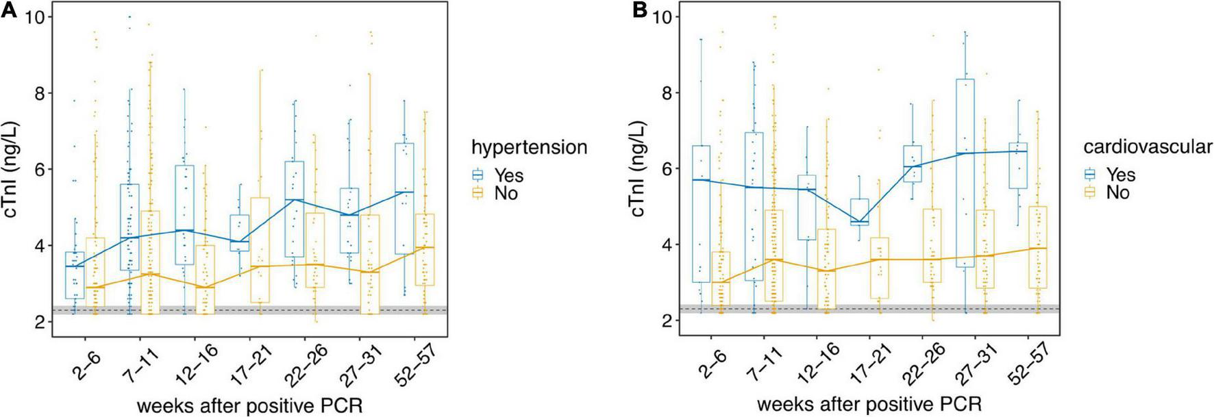 The course of hs troponin I concentrations according to different co-morbidities. The course of hs troponin I concentrations (cTnI) over a period of more than 1 year [high sensitive (Beckman Coulter Switzerland, Nyon, Switzerland] assay) after mild to moderate SARS-CoV-2 infections depending on different co-morbidities is presented. Black dotted line indicate the limit of detection and limit of quantification, both at 2.3 ng/L. Horizontal bold lines indicate median values; boxes indicate quartiles 1 and 3; whiskers indicate 1.5 × IQR confidence intervals (CI). Gray shaded region indicate the 95% CI of the cTnI of the control cohort (n = 115). Each point represents a single measurement. (A) The cohort is split by data from the survey indicating hypertension (Yes, blue) or no hypertension (No, yellow). The course of cTnI over time is presented. (B) The cohort is split by data from the survey indicating an occurrence of a known cardiovascular disease (Yes, blue) or no cardiovascular disease (No, yellow). The course of cTnI over time is presented.