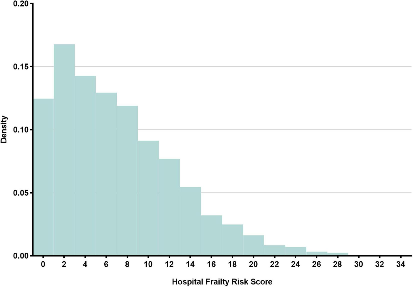 Histograms showing the distribution of the Hospital Frailty Risk Score (HFRS).
