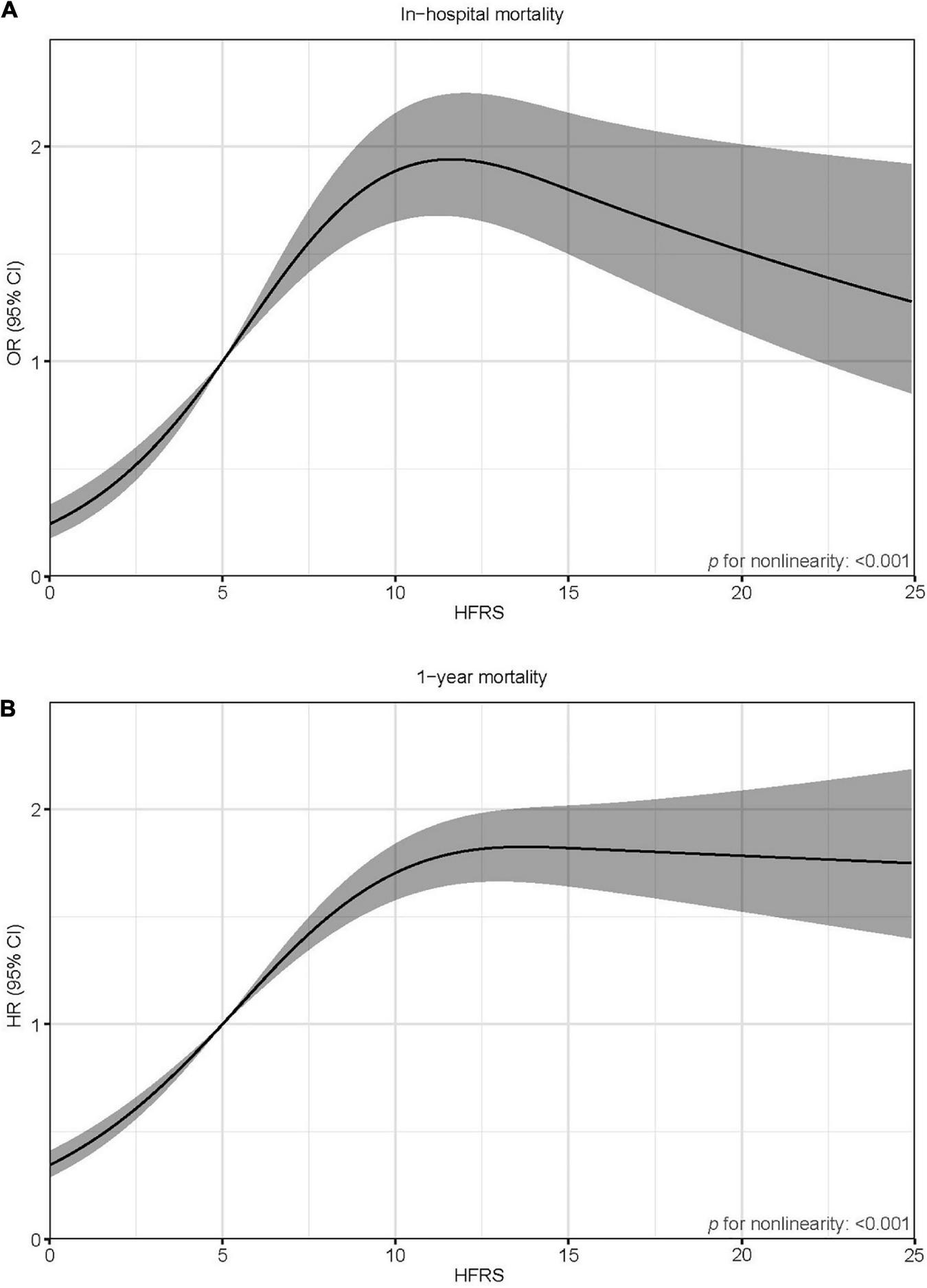 Spline curves showing the association of the HFRS as a continuous variable with in-hospital mortality (A) and 1-year mortality (B). Spline curves were adjusted for age, sex, ethnicity, the CCI, AMI type, and SOFA score.