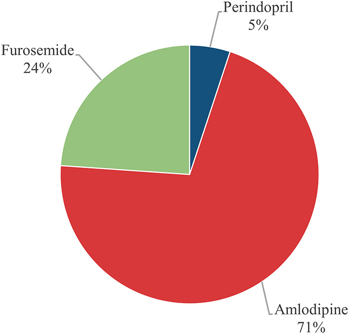 The results showed that there was a significant difference in age between the groups (H = 107.33, P = 0.000), and the age of patients in the group using Furosemide [79.00 (73.00, 84.00)] was higher than in the other two groups [74.00 (69.00, 79.00)]. In laboratory tests, there were significant differences in SBP, DBP, Lymph, RBC, HCT, MCHC, PLT, AST, TBIL, Cr, UA, Urea, K, Na, Ga, TP, GLU, TC, TG, and γ-GT (P < 0.05, Table 1). There was a significant difference in the proportion of males and females using drugs in the three groups (χ2 = 20.665, P = 0.000). Men use Amlodipine and Furosemide more frequently than women, and in contrast, women use Perindopril more regularly than men. Among previous disease history, there was a statistically significant difference in HTN (χ2 = 31.664, P = 0.000), CAD (χ2 = 24.805, P = 0.000), and RI (χ2 = 11.806, P = 0.003) (Table 1).