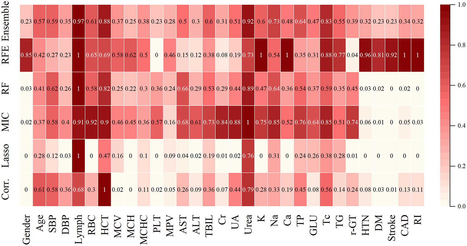 In this study, we used five ML algorithms for feature selection, namely Pearson correlation coefficient, Lasso, maximum information coefficient (MIC), random forest (RF), and recursive feature elimination (REF). The five ML models were built into an ensemble model according to specific rules. Finally, combined the ensemble model with statistical analysis to obtain the final feature indicators. For a better comparison, values of all attributes were Min-Max normalized to a standard range using the following formula: