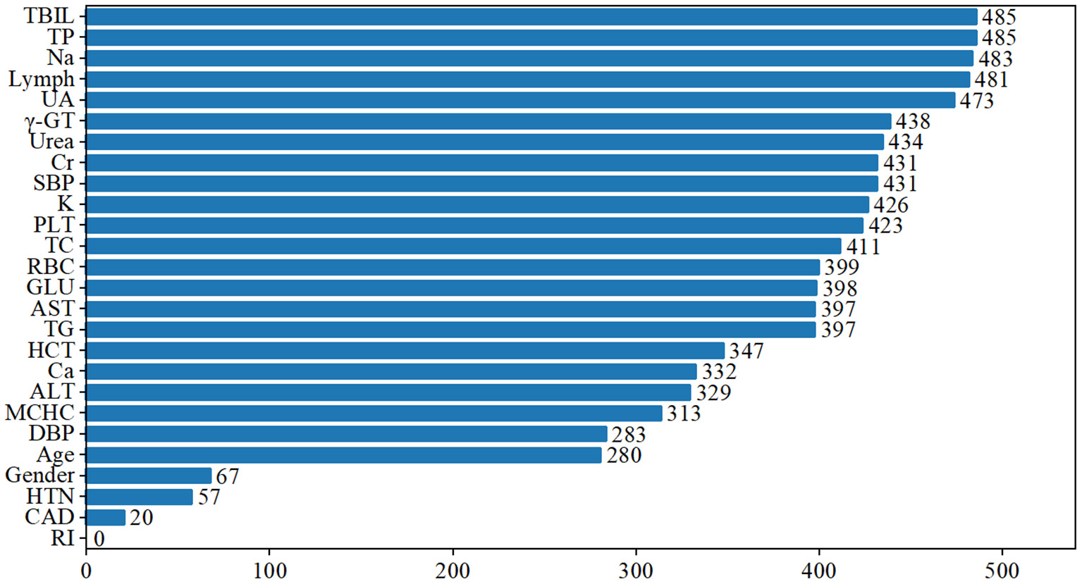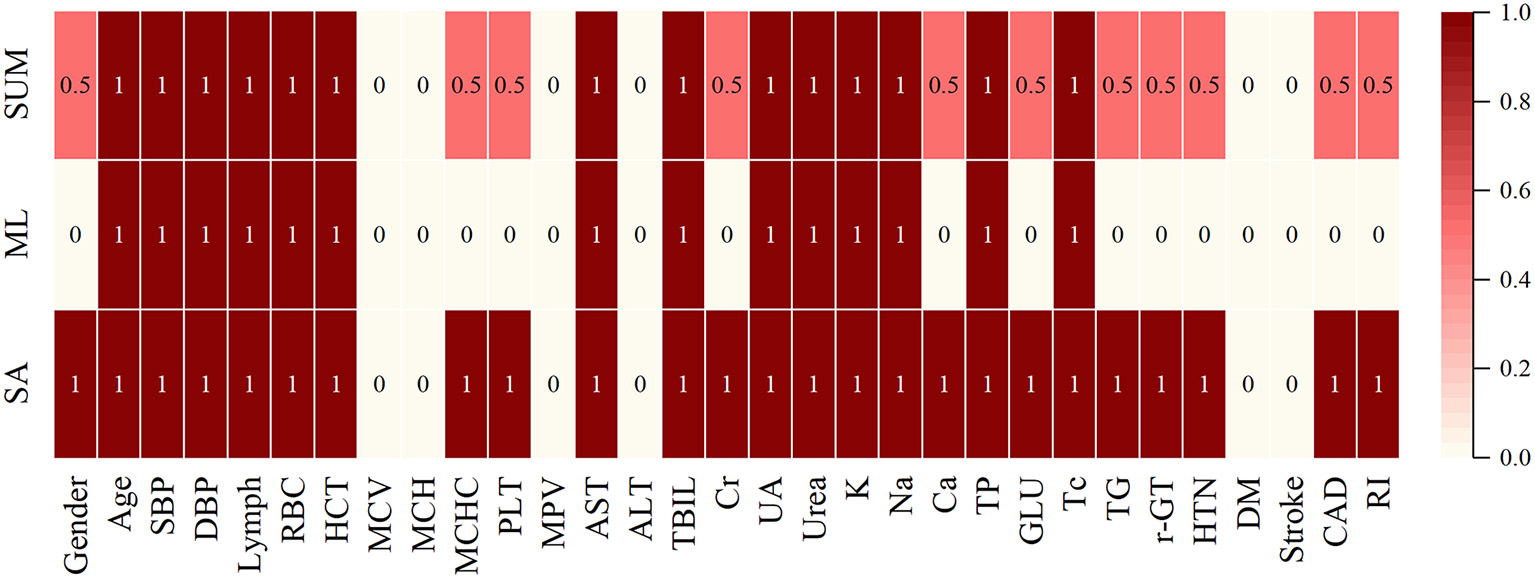 According to the algorithm analysis, Lymph, Urea, HCT, TC, Na, TP, RBC, TBIL, K, SBP, Age, TG, UA, and AST were the essential features affecting the selection of medication for hypertension. The outcomes of the above feature selection procedures were summed together, with deeper colors indicating more crucial features (Table 2, Figure 3).