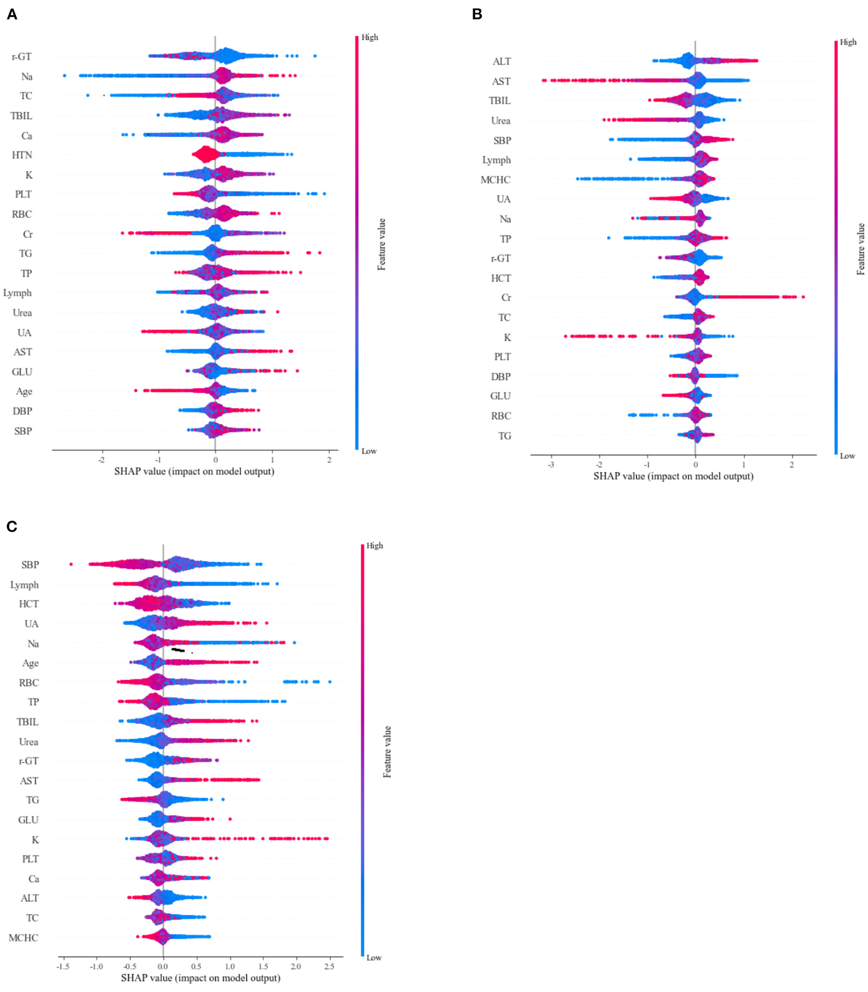 We chose gender and age at the time of presentation from basic information, blood pressure from admission records, and a history of hypertension (HTN), coronary artery disease (CAD), diabetes, stroke, and renal insufficiency (RI). In the beginning, 47 indicators were chosen from the clinical tests based on the recommendations of specialists. However, certainly expected indications were absent from the majority of samples. In addition to the fact that professionals pay more attention to the essential characteristics during real diagnosis and therapy, we ultimately chose 22 attributes. The 22 attributes were: glucose (GLU), total cholesterol (TC), triglycerides (TG), potassium (K), sodium (Na), calcium (Ca), creatinine (Crea), serum uric acid (UA), serum urea (Urea), aspartate aminotransferase (AST), alanine aminotransferase (ALT), γ-glutamyl transpeptidase (γ-GT), total bilirubin (TBIL), total protein (TP), red blood cell (RBC), hematocrit (HCT) level, mean corpuscular volume (MCV), mean corpuscular hemoglobin (MCH), mean corpuscular hemoglobin concentration (MCHC), lymphocyte (Lymph) count, platelet (PLT) count, and mean platelet volume (MPV). The standard reference ranges for blood pressure and laboratory indices were listed in Supplementary Table S1.