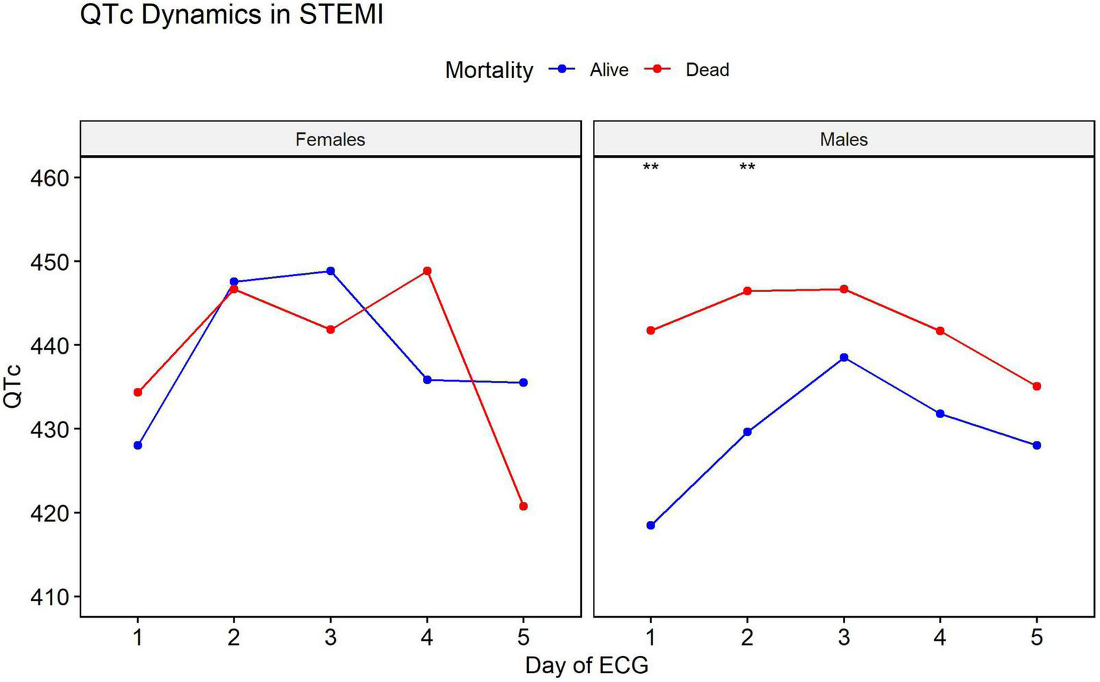 We characterized the QT behavior during the immediate period following acute STEMI. The QT interval elongates starting at the acute event and peaks at day three when it begins to shorten. At day five, which serves as a common discharge timepoint, QT does not reach baseline values. Prolonged QT duration at hospitalization, at day two, and prior to discharge is associated with mortality in males, but not in females (with the caveat that the smaller number of females in our cohort may have hampered the power to detect such associations).
