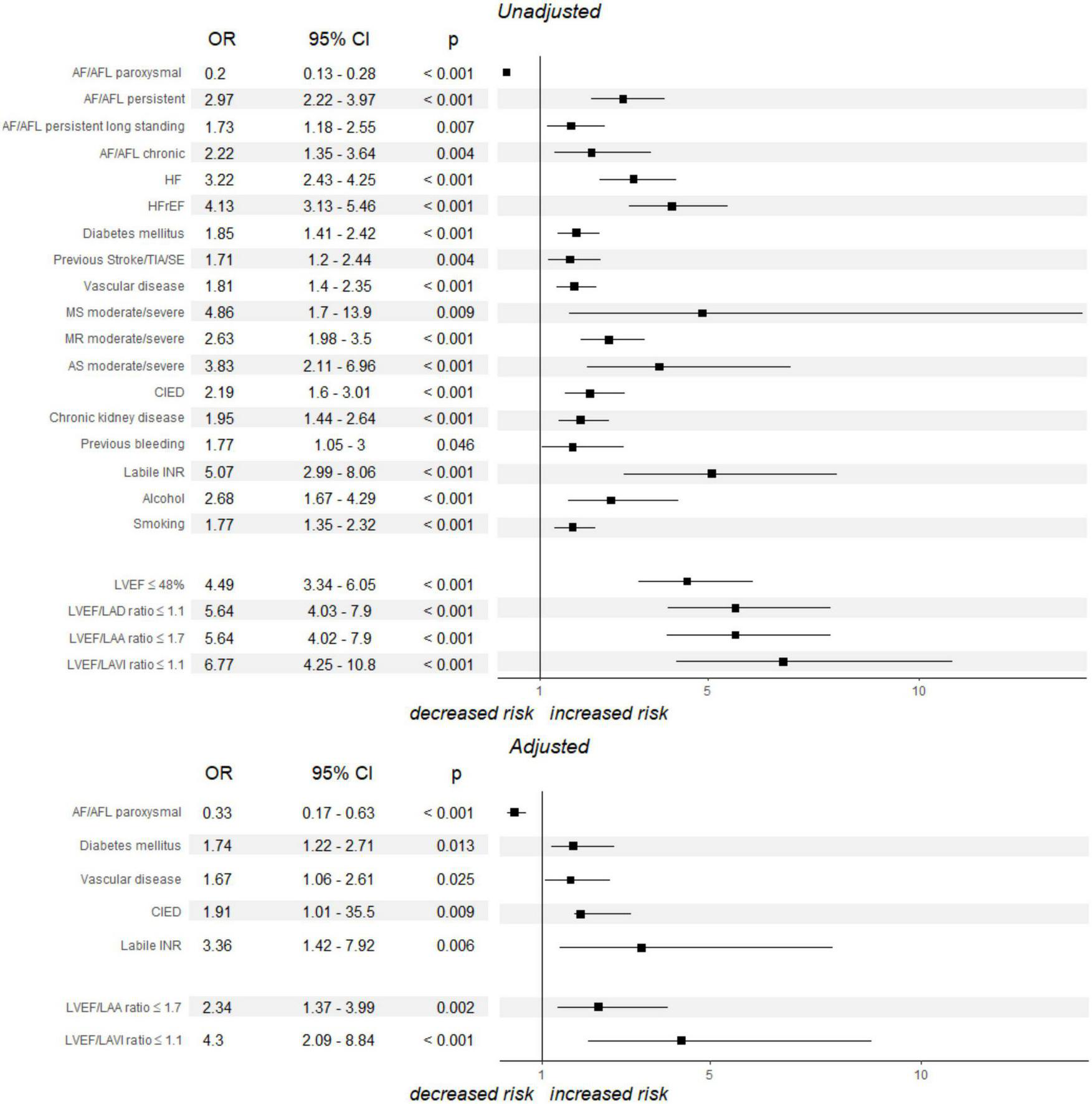 Univariate and multivariate logistic regression analysis models estimating the likelihood of LAAT. p-values refer for the differences between LAAT+ and LAAT- groups. AF, atrial fibrillation; AFL, atrial flutter; AS, aortic stenosis; CI, confidence interval; CIED, cardiac implanted electrical device; HF, heart failure; HFrEF, heart failure with reduced left ventricular ejection fraction; INR, international normalized ratio; LAA, left atrial area; LAAT, left atrial appendage thrombus; LAD, left atrial diameter; LAVI, left atrial volume index; LVEF, left ventricular ejection fraction; MR, mitral regurgitation; MS, mitral stenosis; OR, odds ratio; SE, systemic embolism; TIA, transient ischemic attack.