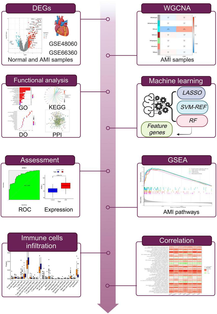 Overall, we found that seven powerful diagnostic efficacy genes were present in patients with AMI, indicating that they provide new potential targets for diagnosis and maybe progression of AMI, thus leading to improved outcomes. Different from other similar studies, we used more machine learning methods to enhance the accuracy of gene screening, and focused on exploring the specific genes that have the most obvious impact on AMI. It can also provide more accurate direction guidance for future AMI research. Overall, our research aims to provide new ideas and directions for clinical diagnosis and precise treatment management of AMI.