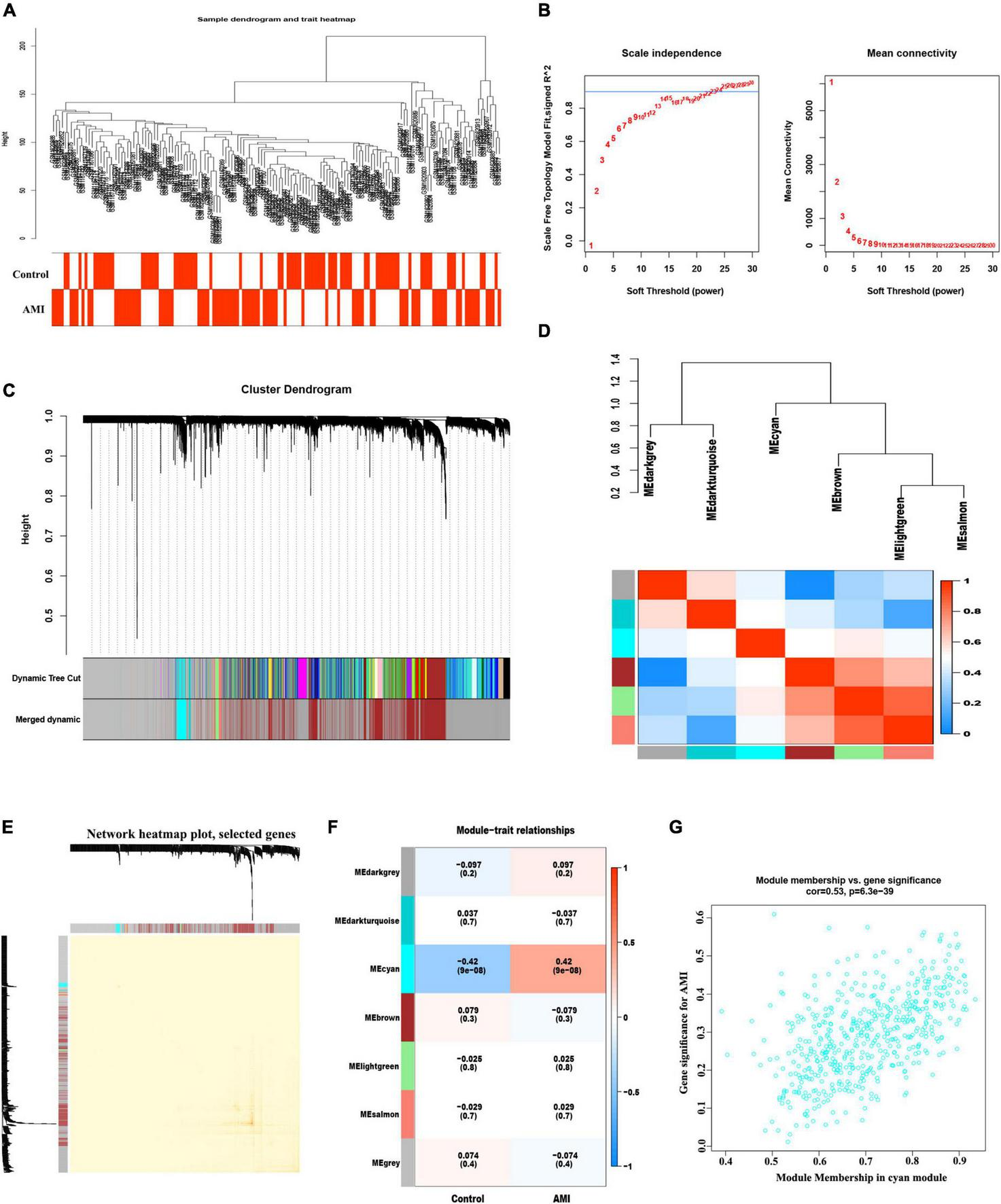 Weight correlation network analysis. (A) Sample clustering dendrogram with tree leaves corresponding to individual samples. (B) Analysis of the scale-free fit index (R2) and the mean connectivity for various soft-thresholding powers. (C) The original and combined modules under the clustering tree with cut-off values height of 0.25. (D) Collinear heat map of module feature genes. Red color indicates a high correlation, blue color indicates the opposite results. (E) Clustering dendrogram of module feature genes. (F) Heat map of module–trait correlations. Red represents positive correlations and blue represents negative correlations. (G) MM vs. GG scatter plot of AMI for cyan module.