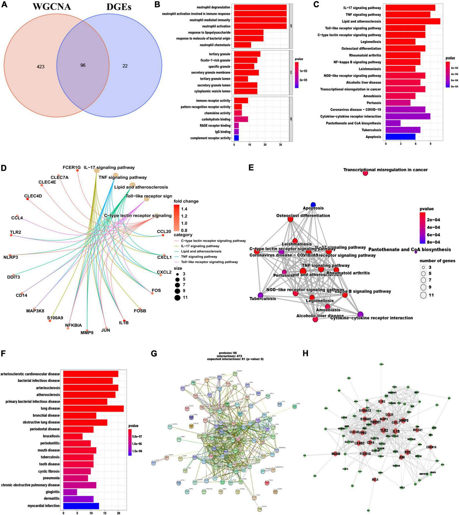 Identification and functional enrichment analyses of overlapping candidate genes. (A) Venn diagram showed the intersection of DEGs and module genes of WGCNA. (B–F) GO (B), KEGG (C–E), and DO (F) enrichment analysis of the overlapping candidate genes. (G) Protein-Protein Interaction (PPI) network of overlapping candidate genes. (H) The co-expression network showing correlation intensity of hub genes from overlapping candidate genes.