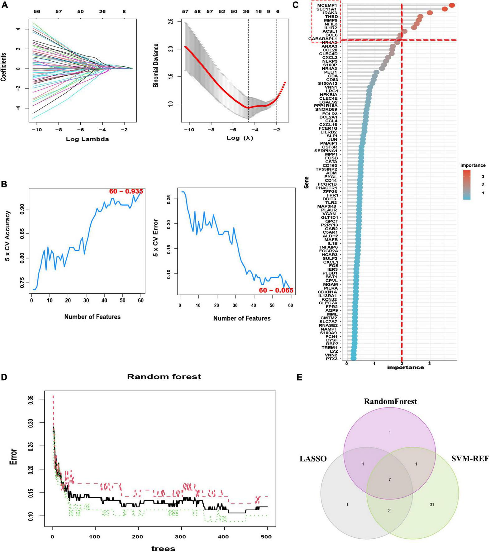 Three machine learning algorithms were integrated to identify the optimal feature genes. (A) LASSO coefficient profiles of the candidate optimal feature genes and the optimal lambda was determined when the partial likelihood deviance reached the minimum value. Each coefficient curve in the left picture represents a single gene. The solid vertical lines in right picture represent the partial likelihood deviance, and the number of genes (n = 30) corresponding to the lowest point of the cure is the most suitable for LASSO. (B) The SVM-RFE algorithm was used to further candidate optimal feature genes with the highest accuracy and lowest error obtained in the curves. The x-axis shows the number of feature selections, and the y-axis shows the prediction accuracy. (C) Relative importance of overlapping candidate genes calculated in random forest (Top 10 genes’ importance > 2). Importance indexes on the x-axis and genetic variables are plotted on the y-axis. (D) Random forest for the relationships between the number of trees and error rate. The x-axis represents the number of decision trees and the y-axis is the error rate. (E) Venn diagram showing the seven optimal feature genes shared by LASSO, Random Forest, and SVM-REF algorithms.