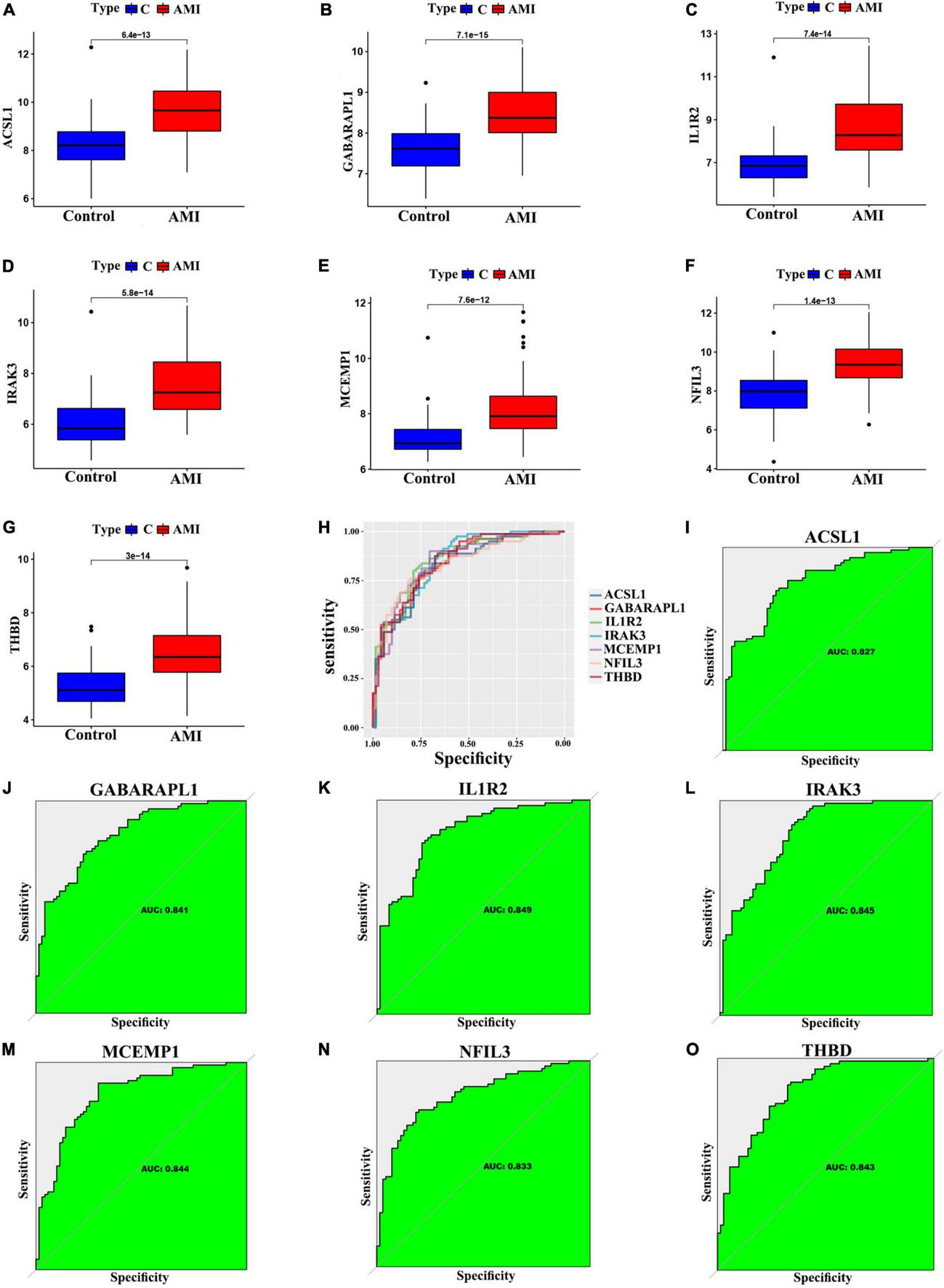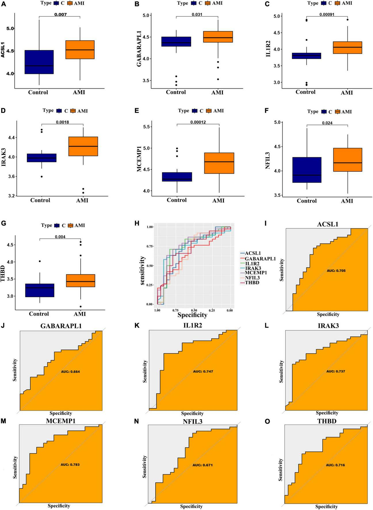Verification of expression and diagnostic efficacy in predicting AMI progression of optimal feature genes. (A–G) Box plots showing the expression of ACSL1 (A), GABARAPL1 (B), IL1R2 (C), IRAK3 (D), MCEMP1 (E), NFIL3 (F), and THBD (G) in control and AMI samples. Statistic tests: Wilcoxon rank-sum test. (H–O) Roc curves (H) estimating the diagnostic performance of ACSL1 (I), GABARAPL1 (J), IL1R2 (K), IRAK3 (L), MCEMP1 (M), NFIL3 (N), and THBD (O).