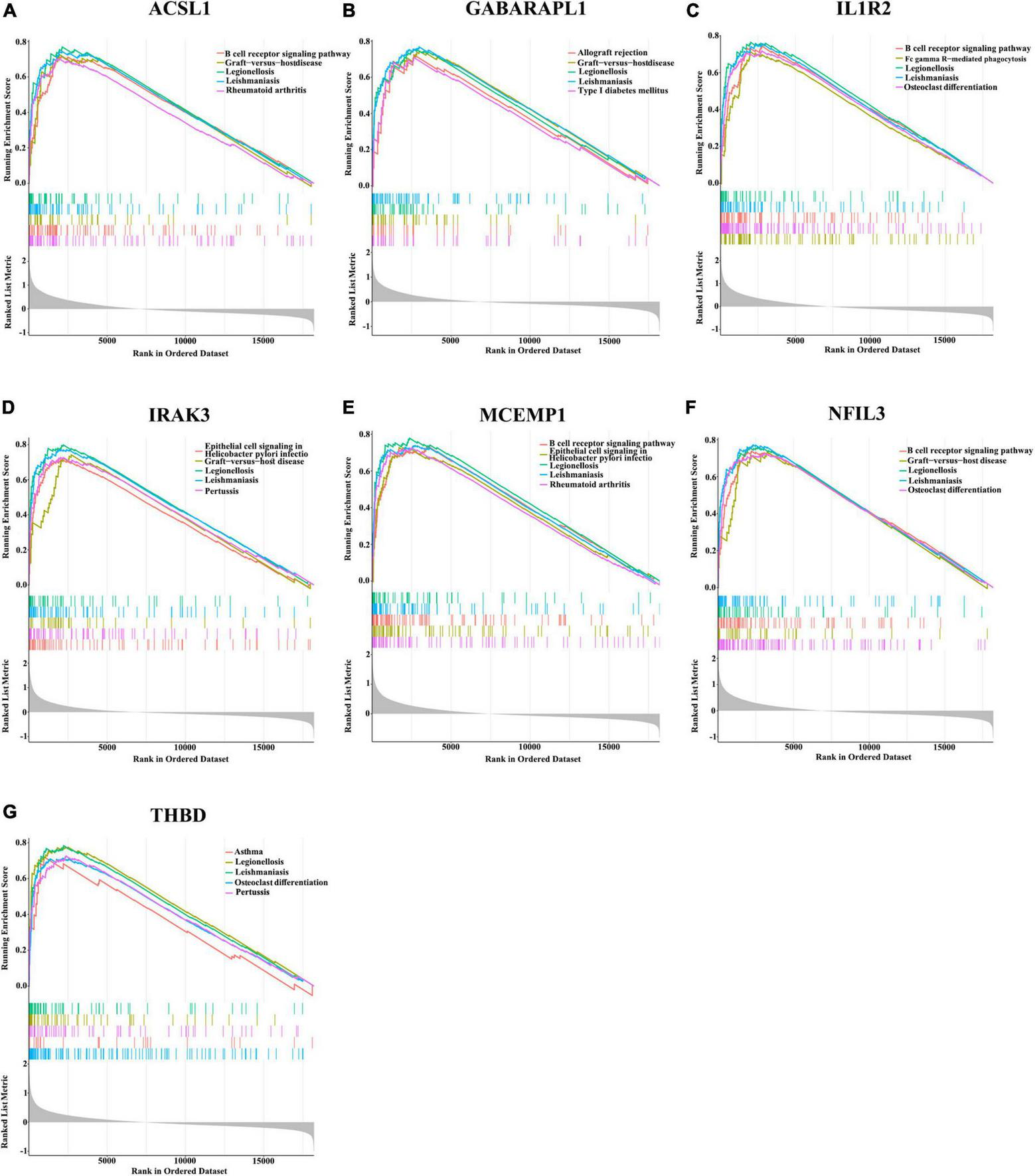 Gene sets enrichment analysis (GSEA) identifies signaling pathways in the optimal feature genes. (A–G) Top five signaling pathways that are significantly enriched in the high expression of ACSL1 (A), GABARAPL1 (B), IL1R2 (C), IRAK3 (D), MCEMP1 (E), NFIL3 (F), and THBD (G).