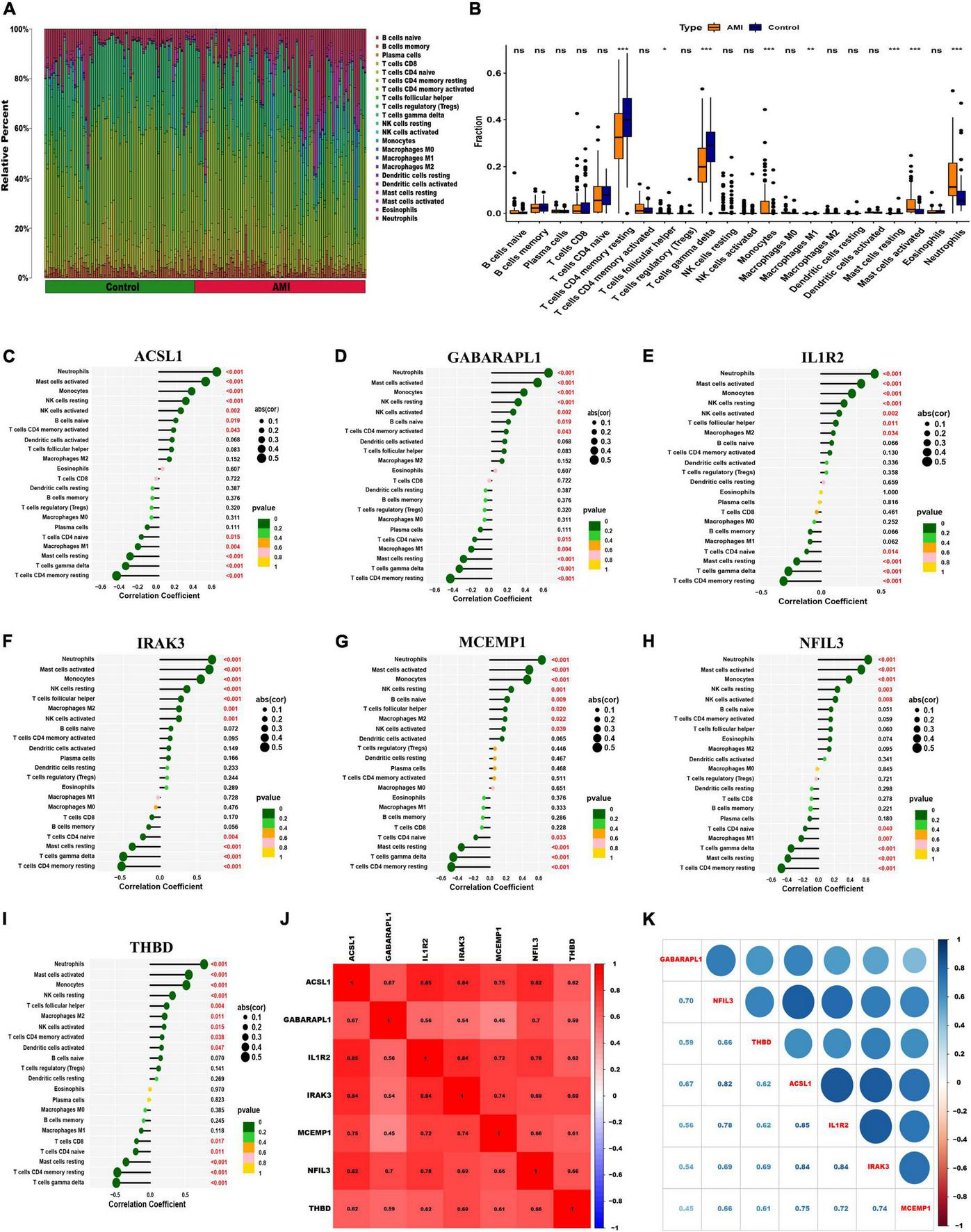 Visualization of immune cell infiltration. (A) The relative proportions of 22 immune cells types between control samples and AMI samples. Panel (B) representative boxplot shows the differences of infiltrated immune cells between control samples and AMI samples. Statistic tests: Wilcoxon rank-sum test. (P < 0.05*; P < 0.01**; P < 0.001***; ns, no significance). (C–I) Correlation between immune cells and optimal feature genes ACSL1 (C), GABARAPL1 (D), IL1R2 (E), IRAK3 (F), MCEMP1 (G), NFIL3 (H), and THBD (I); the larger the dots, the stronger the correlation. The color of the dots represents the P-value; the greener the color, the lower the P-value. (J,K) Correlation analysis of seven optimal feature genes in AMI samples.