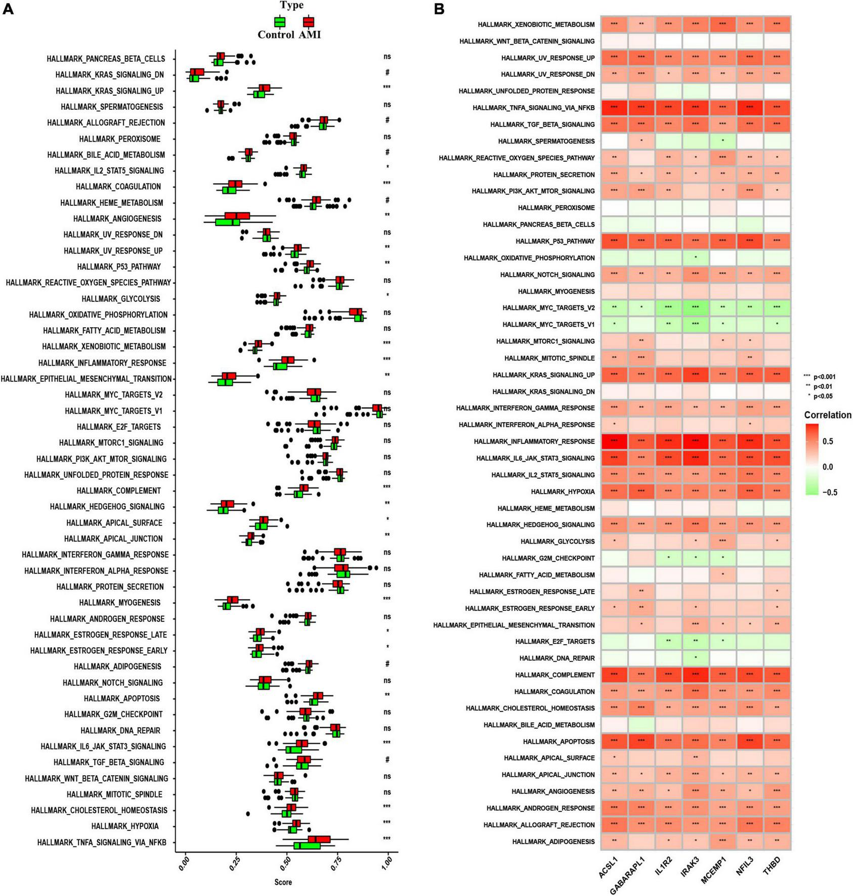 Analysis of hallmark gene sets. (A) The specific distribution of the 50 hallmark gene sets in AMI and control samples. (B) Correlation analysis of the 50 hallmark gene sets with seven optimal feature genes. Statistic tests: Wilcoxon rank-sum test (P < 0.2#; P < 0.05*; P < 0.01**; P < 0.001***; ns, no significance).