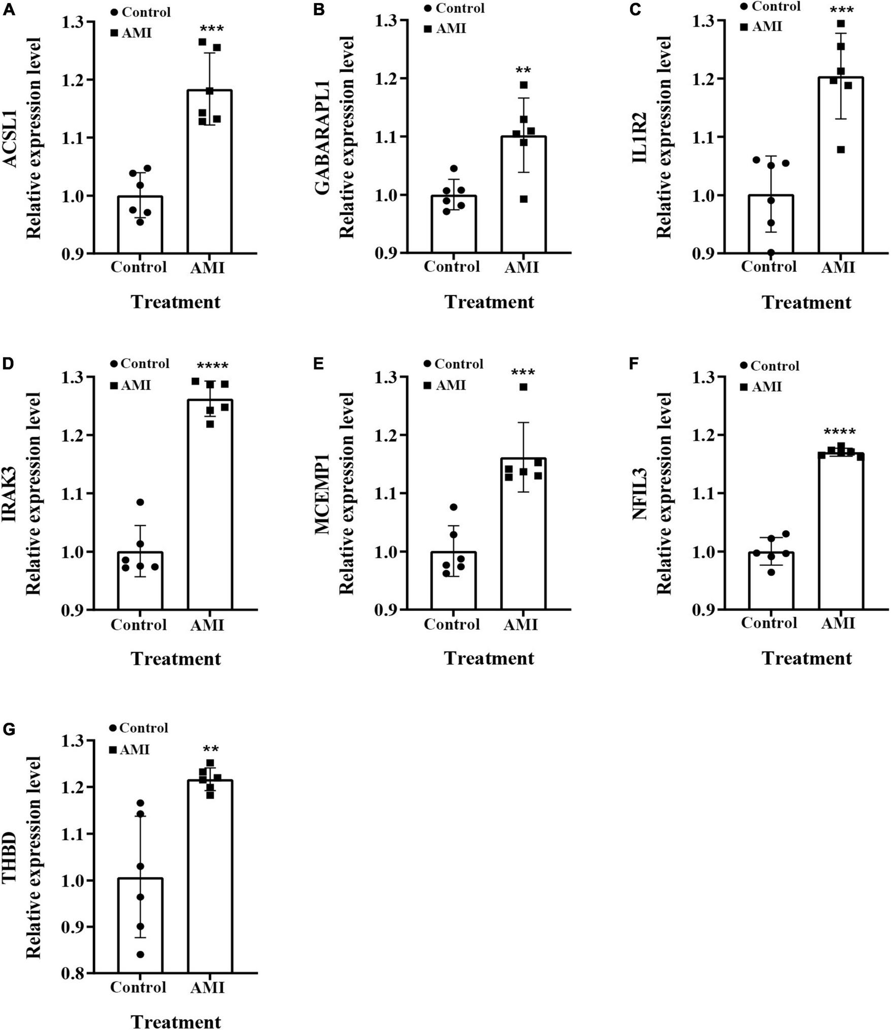 The relative expressions of optimal feature genes were validated by qRT-PCR. (A–G) The expressions of ACSL1 (A), GABARAPL1 (B), IL1R2 (C), IRAK3 (D), MCEMP1 (E), NFIL3 (F), and THBD (G) between AMI patients and healthy subjects. Statistic tests: Student’s t-test (P < 0.01**; P < 0.001***; P < 0.0001****).