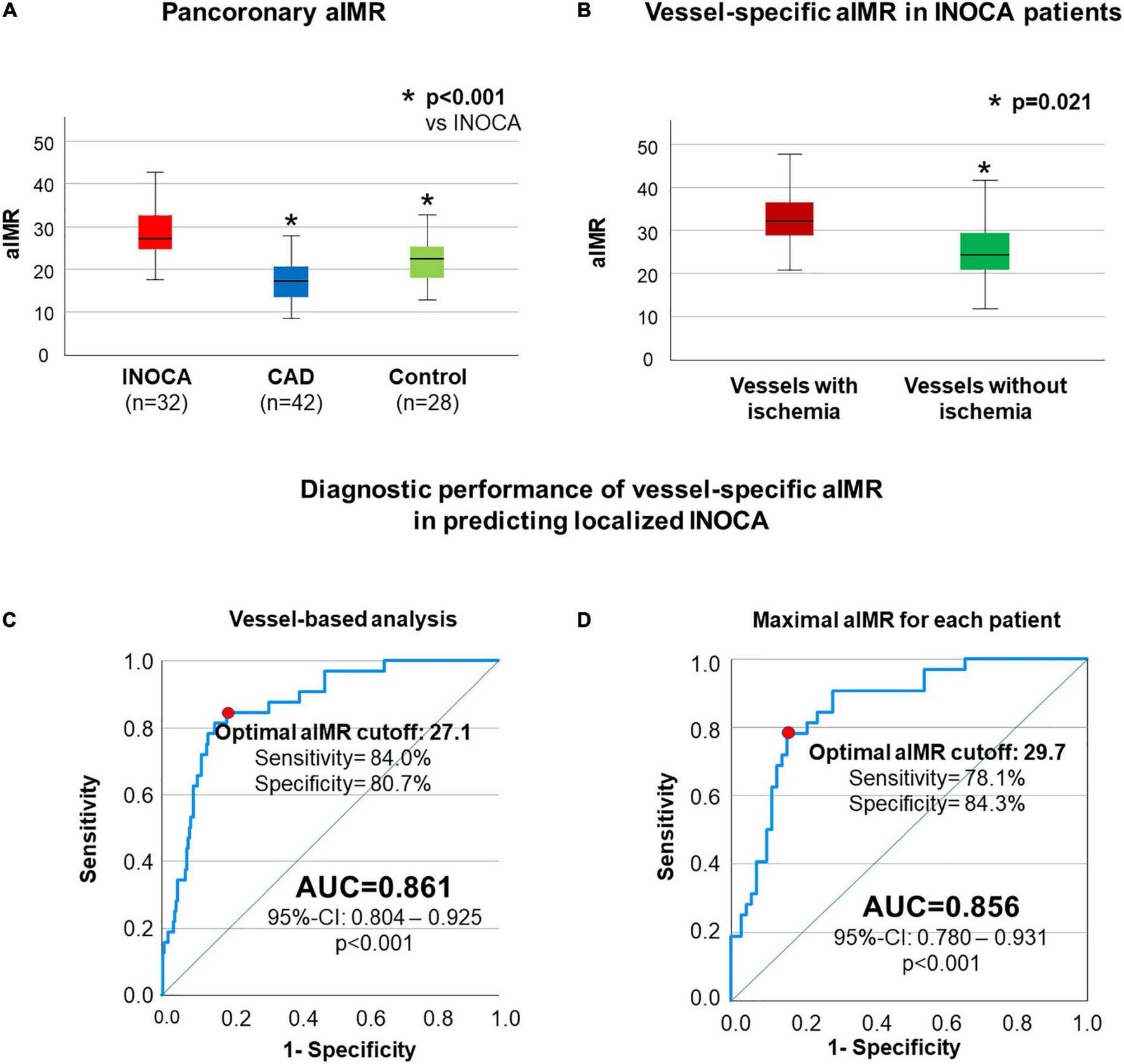 aIMR is higher in INOCA patients and vessels supplying ischemic myocardium. In (A) a significantly higher pancoronary aIMR in patients with INOCA compared to both CAD and control patients is shown. In (B) a comparison between single-vessel aIMR in INOCA patients is reported, showing significantly higher aIMR in vessels supplying ischemic myocardium compared to the rest of the coronary tree. ROC-analysis assessing vessel-specific aIMR in order to predict ischemia in cMRI in the supplied myocardium without obstructive CAD is shown in (C,D) including in the analysis all coronary vessels (C) or only the vessels with maximal aIMR for each patient (D).
