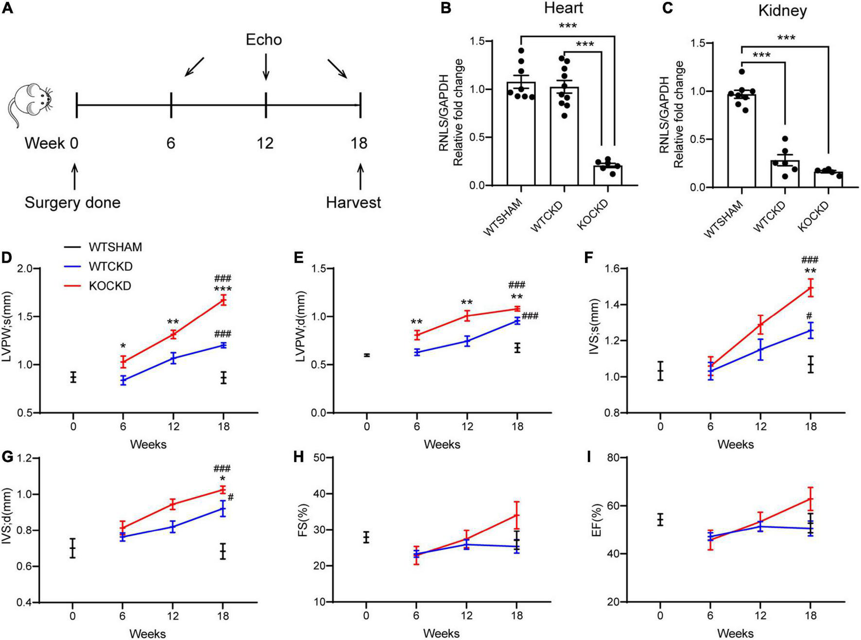 RNLS deficiency aggravated pathologic LVH induced by CKD. (A) Design of the experiment. Echocardiography was performed at 6, 12, and 18 weeks after surgery. Mice were sacrificed at 18 weeks. (B,C) qPCR analysis of the relative mRNA expression of RNLS in the hearts and kidneys. n = 5–10 per group, ***p < 0.001. (D–I) Echocardiographic parameters, including LVPWs, LVPWd, IVSs, IVSd, FS, and EF at 0, 6, 12, and 18 weeks. WTSHAM group, n = 9; WTCKD group, n = 10; KOCKD group, n = 9. Data were shown as mean ± SEM. *p < 0.05, **p < 0.01, ***p < 0.001. #p < 0.05, ###p < 0.001. * vs. WTCKD group, # vs. WTSHAM group. LVPW, left ventricle posterior wall; IVS, interventricular septum; d, diastole; s, systole; FS, fractional shortening; EF, ejection fraction.