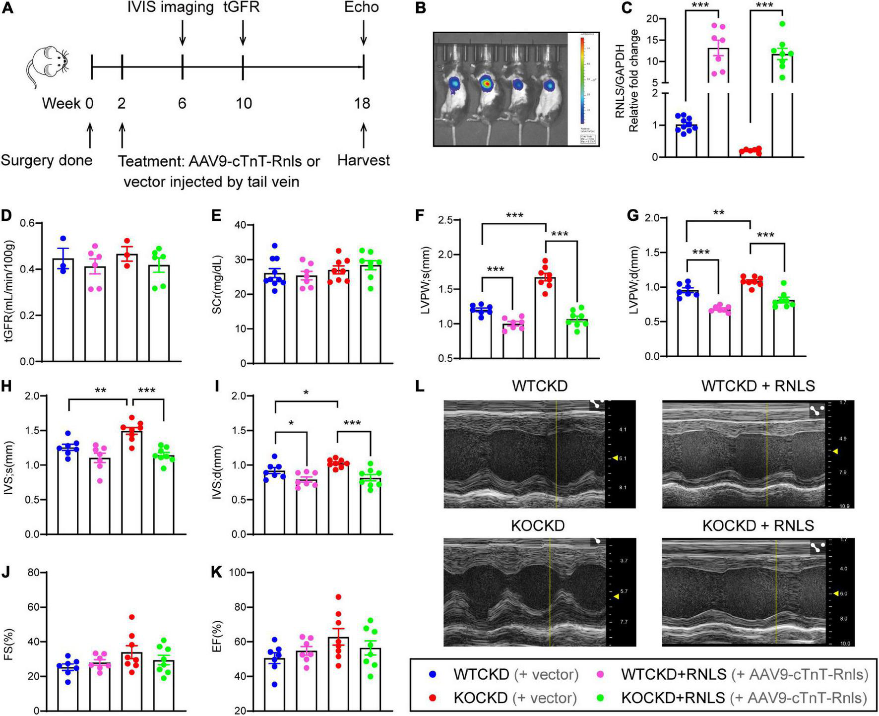 AAV9-cTnT-Rnls alleviated LVH hypertrophy in WTCKD and KOCKD mice. (A) Design of the experiment. WTCKD and KOCKD mice were injected with either AAV9-cTnT-Rnls or vector via tail vein at 2 weeks. The biodistribution of the virus was monitored by IVIS spectrum 4 weeks after injection (at 6 weeks). tGFR (ml/min/100 g) was detected at 10 weeks. Echocardiography was performed at 18 weeks, then mice were sacrificed. (B) Representative image using the in vivo Imaging System (IVIS) spectrum. A random representative was chosen from each group. (C) qPCR analysis of the mRNA expression of RNLS in the hearts. n = 6–10, ***p < 0.001. (D) tGFR measured by transdermal patch at 10 weeks. n = 3–6 per group. (E) Serum creatinine of CKD groups at 18 weeks. n = 6–8 per group. (F–K) Echocardiographic parameters, including LVPWs, LVPWd, IVSs, IVSd, FS, and EF at 18 weeks. WTCKD + vector group, n = 10; WTCKD + AAV9-cTnT-Rnls group, n = 7; KOCKD + vector group, n = 9; KOCKD + AAV9-cTnT-Rnls group, n = 8. Data were shown as mean ± SEM. *p < 0.05, **p < 0.01, ***p < 0.001. (L) Representative B-mode and M-mode echocardiographic images of each group. tGFR, transcutaneous glomerular filtration rate; LVPW, left ventricle posterior wall; IVS, interventricular septum; d, diastole; s, systole; FS, fractional shortening; EF, ejection fraction.