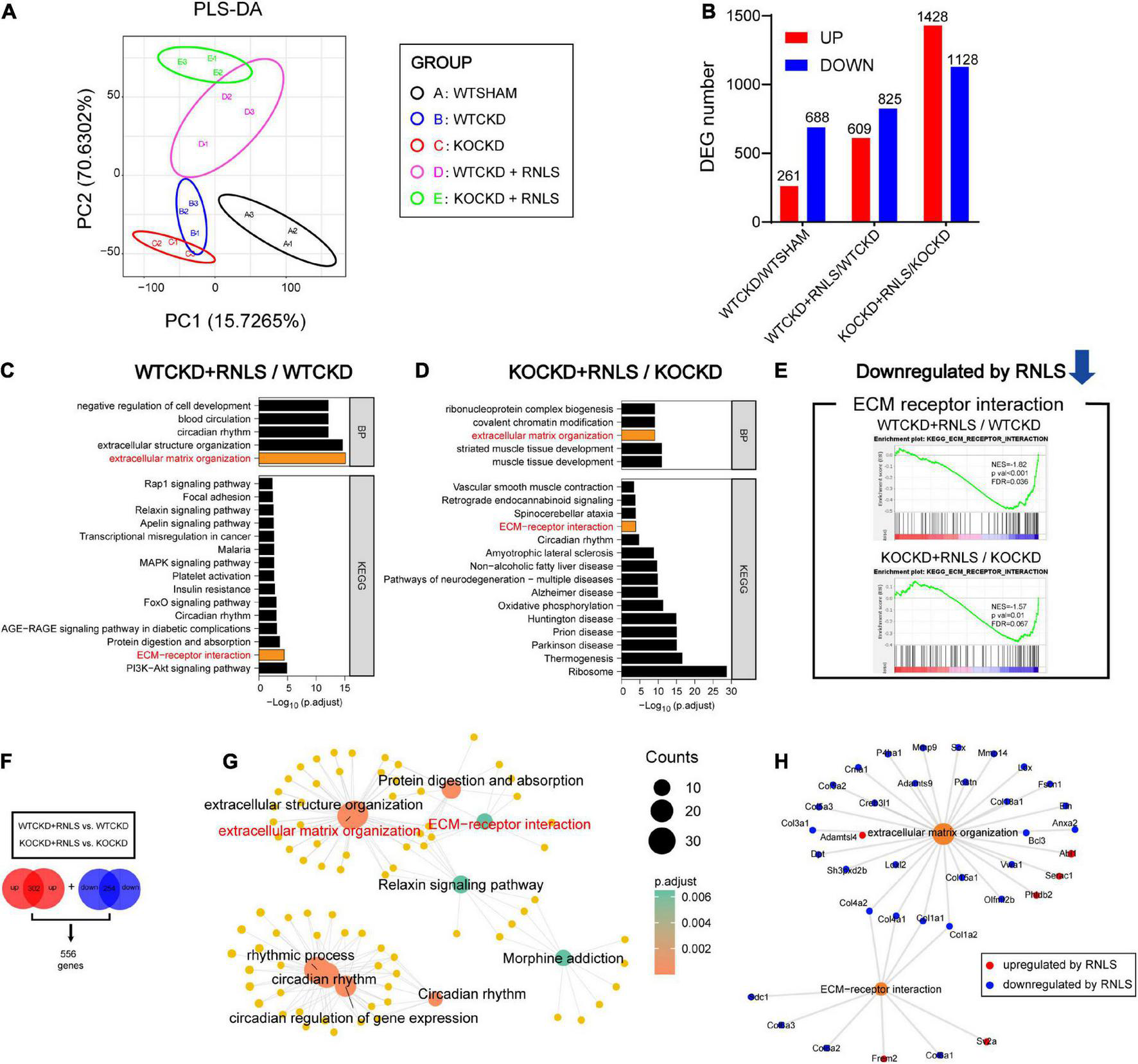 Overexpression of RNLS downregulated ECM organization and ECM-receptor interaction in CKD hearts. (A) Partial Least Squares Discriminatory Analysis (PLS-DA) score plot shows that groups are separated to, respectively, different clusters. n = 3 per group. (B) The number of differentially expressed genes (DEGs) in WTCKD/WTSHAM, WTCKD + RNLS/WTCKD, and KOCKD + RNLS/KOCKD (DEGs were selected by p < 0.05, |log2FC| > 0.32). (C,D) GOBP and KEGG analysis of DEGs in WTCKD + RNLS/WTCKD and KOCKD + RNLS/KOCKD. The top 5 of GOBP and the top 15 of KEGG pathways are shown. (E) GSEA revealed that the ECM-receptor interaction pathway was downregulated by RNLS overexpression. (F) The overlapped upregulated DEGs and downregulated DEGs between WTCKD + RNLS/WTCKD and KOCKD + RNLS/KOCKD clusters. (G) Diagram showing the top 5 items of the GOBP and KEGG analysis enriched by 556 DEGs in (F). (H) Diagram showing DEGs enriched in ECM organization and ECM-receptor interaction. WTCKD, WTCKD + vector group; WTCKD + RNLS, WTCKD + AAV9-cTnT-Rnls group; KOCKD, KOCKD + vector group; KOCKD + RNLS, KOCKD + AAV9-cTnT-Rnls group. ECM, extracellular matrix.
