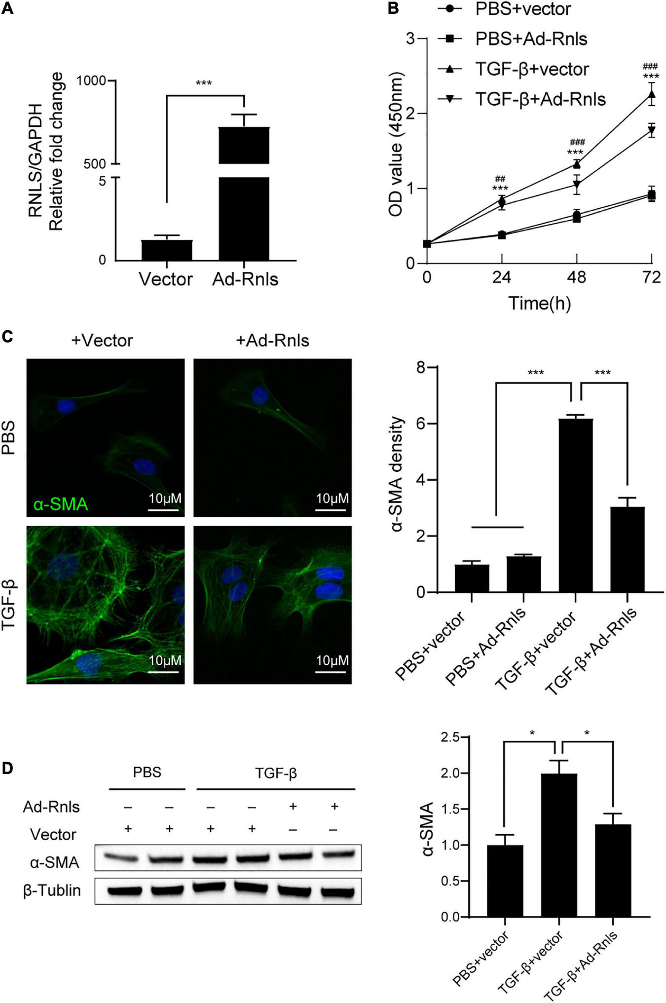 RNLS overexpression inhibited cardiac fibroblasts (CFs) proliferation and the expression of α-SMA stimulated by TGF-β. (A) qPCR analysis of the relative mRNA expression of RNLS. (B) CF proliferation detected by cell counting kit-8 (CCK8) assay. CFs were transfected with Ad-RNLS or vector and followed by stimulated with TGF-β for 24, 48, 72 hrs. ***p < 0.001, ##p < 0.01, ###p < 0.001. * vs. PBS + vector group, # vs. TGF-β + Ad-Rnls group. (C) Immunofluorescence staining for α-SMA (green) and DAPI (blue) in CFs, quantification by Image J. (400×) ***p < 0.001. (D) Representative western blot analysis and its quantification. *p < 0.05. (C,D) CFs were transfected with Ad-RNLS or vector and followed by stimulated with TGF-β for 24 h.