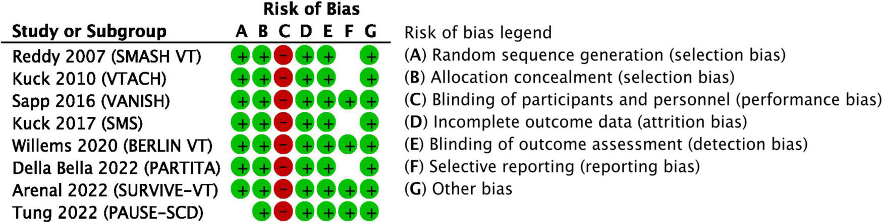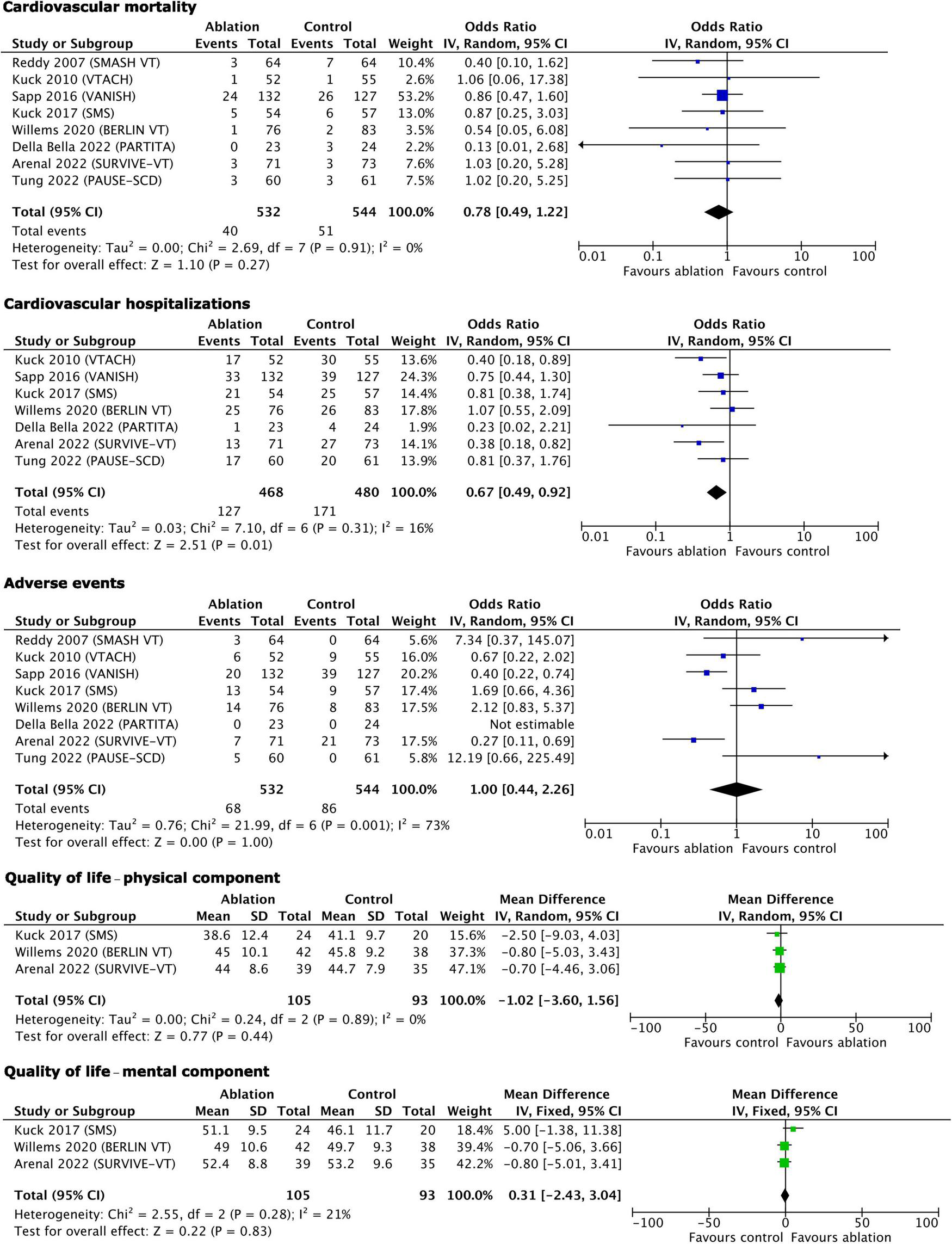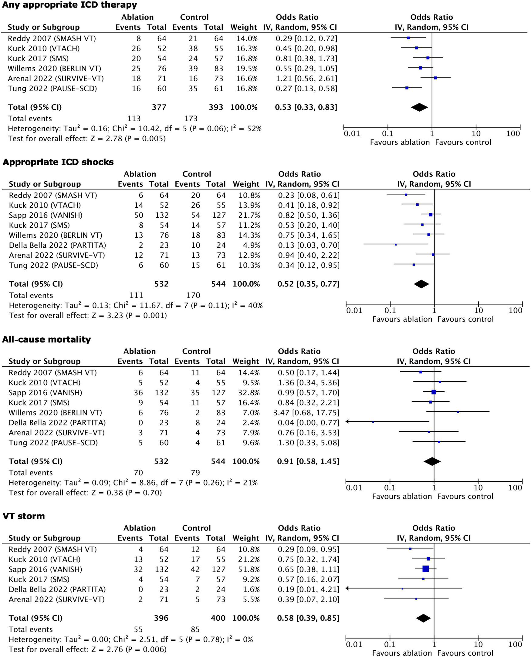 The studies included were selected according to the following PICOS criteria: patients ≥18 years old with structural heart disease and an ICD implanted or planned to be implanted for VT, regardless of the antiarrhythmic drug treatment status; interventional arm with CA performed regardless of the access (endocardial or endo-epicardial) and approach (substrate-guided or electrophysiologically guided ablation); comparison arm with no ablation or deferred ablation; ≥3 of the outcomes reported (see Section “Study selection and outcomes”); published randomized studies with follow-up ≥12 months. The length of follow-up was selected with mortality outcomes in mind.