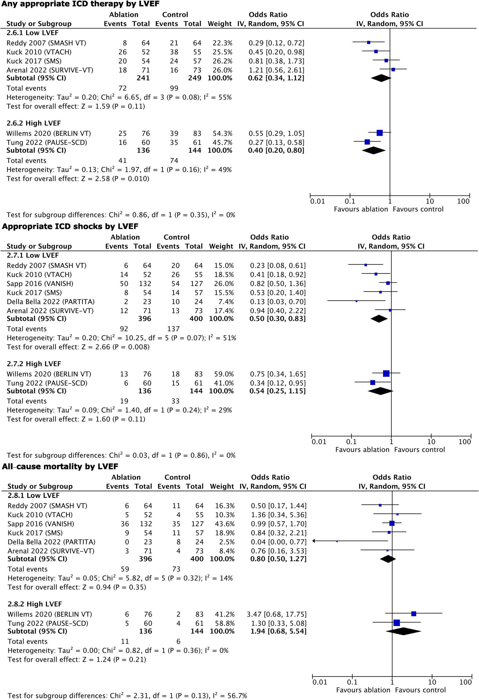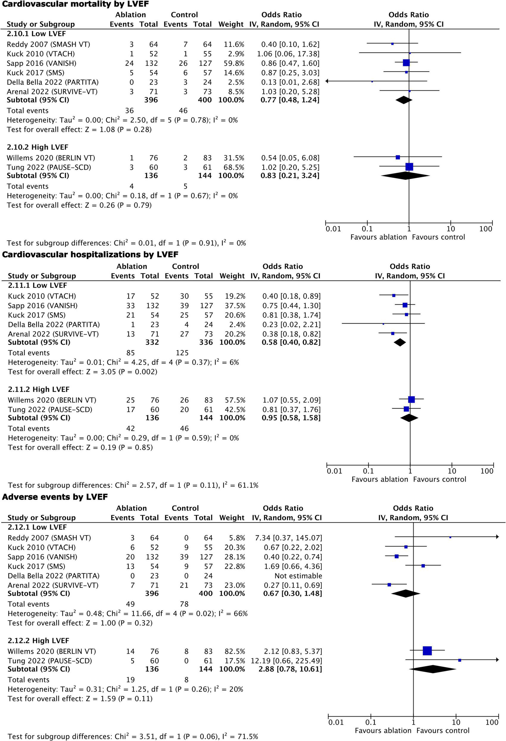 Other data extracted for the systematic review included: first author, year of publication, overall sample size, sample size of the experimental and comparison arms, comparator, inclusion criteria, ablation procedure design, access to the heart, use of navigation system, procedural end-point, primary outcome, secondary outcomes, age, sex, New York Heart Association class, LVEF, hypertension, diabetes mellitus, use of beta-blockers, amiodarone, angiotensin-converting enzyme inhibitors (ACEIs) or angiotensin receptor blockers (ARBs), and mineralocorticoid receptor antagonists, percentage of cardiac resynchronization therapy system with defibrillator (CRT-D) implants, percentage of ICDs implanted before the ablation, length of follow-up, cross-over to the ablation arm, and serious adverse events related to the study procedures.
