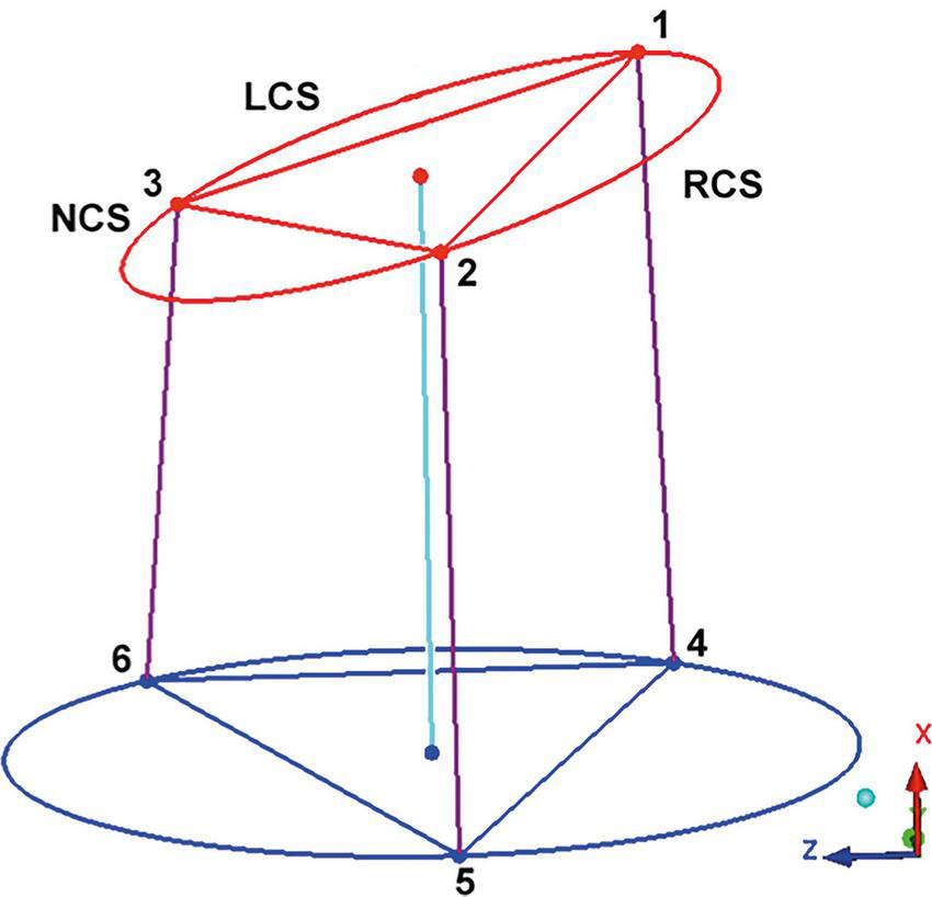 Geometric model of the aortic root. The “123” triangle is positioned in the sinotubular junction. The three edges correspond to the left (LCS), right (RCS), and non (NCS) coronary sinus commissures. The triangle at the aortic root base is marked by the “456” triangle, the basal points correspond to the vertical projection of the three commissures into the root base. By interconnecting the points of both triangles, a model of the aortic root is obtained. This model is a prism where the basal and the sinotubular junction plane are not parallel. The axe of the prism interconnect the center of the sinotubular junction and aortic root base. LCS, left coronary sinus; RCS, right coronary sinus; NCS, non-coronary sinus. Adapted from (16). Copyright Nr 5456880811785.