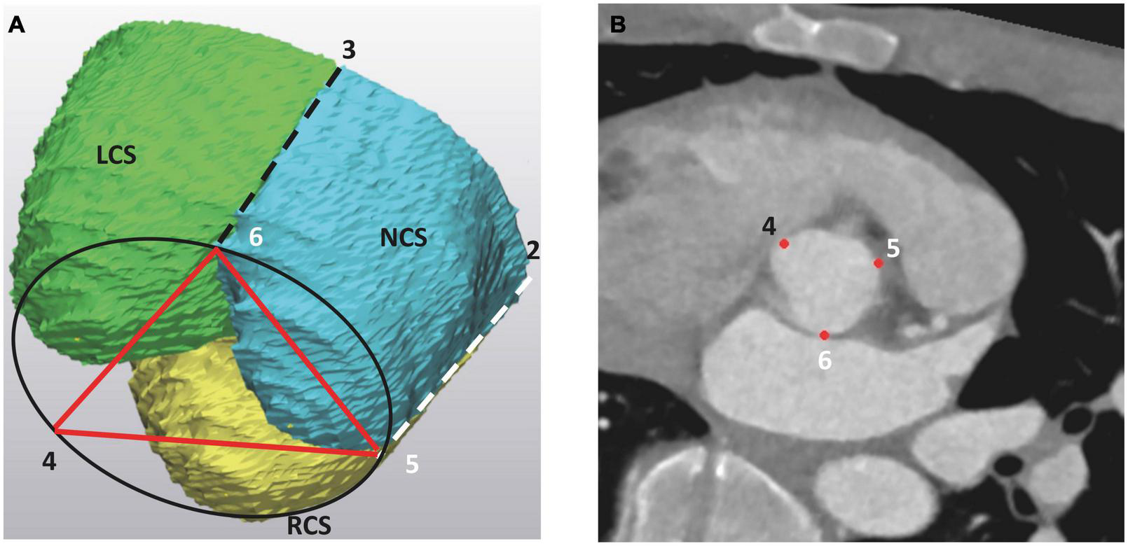The basal landmarks of the aortic root at the level of the aortic root base (AoB), as seen (A) on the 3D model of the aortic root and (B) on the angio CT scan. The basal landmarks “456” correspond to the deepest points at each IVT and are vertical projections of the three commissures into the AoB. On the 3D model, the LCS is marked as green, the RCS is yellow and the NCS is blue. The projection of the left and right commissure to the aortic root base is indicated by dashed lines. LCS, left coronary sinus; RCS, right coronary sinus; NCS, non-coronary sinus.