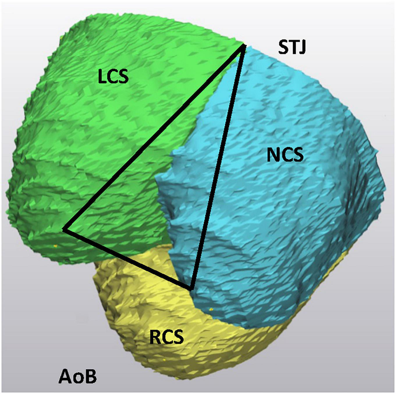 For assessment of the AoR 3D geometry, previously defined morphological landmarks were applied. Briefly, the cranial border of the AoR was defined by the sinotubular junction (STJ). At this level, the three commissures: the anterior, the left, and the right commissure together describe a triangle. The AoR base (AoB), which is a virtual structure, is seen as the deepest point of each individual sinus and of the base of intervalvular triangles (IVT). The mid-point of the each individual IVT was chosen as a landmark at the AoR base. The three basal landmarks at the anterior, left, and right IVT are counterpart elements of the three commissures and also define a triangle (10, 11; Figure 1).