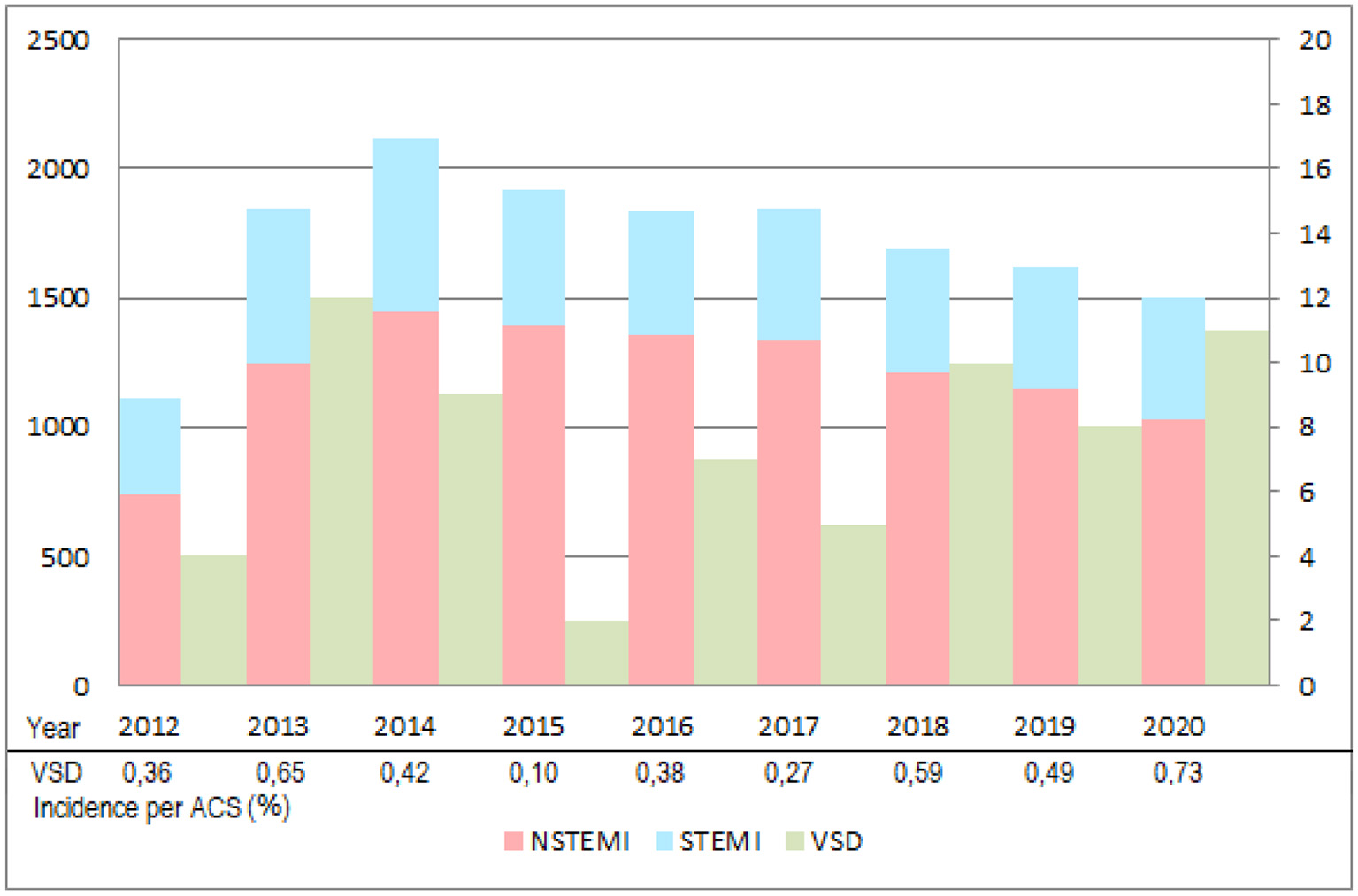 To describe ischaemic VSD incidence, management, and associated in-hospital and 1-year outcomes over a 12-years period.