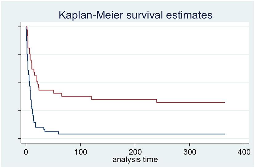 Continuous variables were expressed as means ± standard deviation or as medians with interquartile ranges (IQR) when not normally distributed. Nominal variables were expressed in numbers and percentages. The association between the mean values of continuous variables was assessed using the Mann-Whitney rank sum test or Student′s t-test when appropriate. Nominal variables were assessed by the χ2 test or Fisher′s exact test when appropriate. The patients were separated into two groups based on in-hospital (Supplementary Table S1) or 1-year (Table 1) mortality. Regression analysis was performed using variables with a p-value < 0.05 to analyse variables associated with the criteria of mortality with results reported as odds ratios (OR) with 95% confidence intervals (CI) for in-hospital mortality. A Cox analysis was performed to analyse the factors associated with 1-year mortality and the results were reported as a hazard ratio (HR) with 95% CI (Table 2). A p-value inferior to 0.05 was considered significant. Stata® (14.2 version) software was used for statistical analyses.