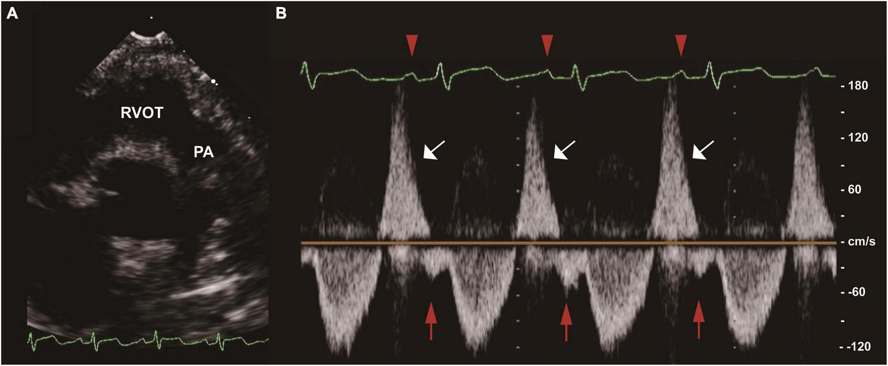 End-diastolic forward flow (EDFF) in a patient after tetralogy of Fallot (TOF) repair. (A) Two-dimensional image of the RVOT and PA in the parasternal long axis view. (B) Pulse wave Doppler of the main PA showing pulmonary regurgitation (white arrow) and late diastolic pulmonary artery forward flow (red arrow), a low velocity forward flow immediately following the p wave of the electrocardiogram (red arrowhead) and preceding the systolic forward flow. EDFF, end-diastolic forward flow; PA, pulmonary artery; RVOT, right ventricular outflow tract; TOF, tetralogy of Fallot.