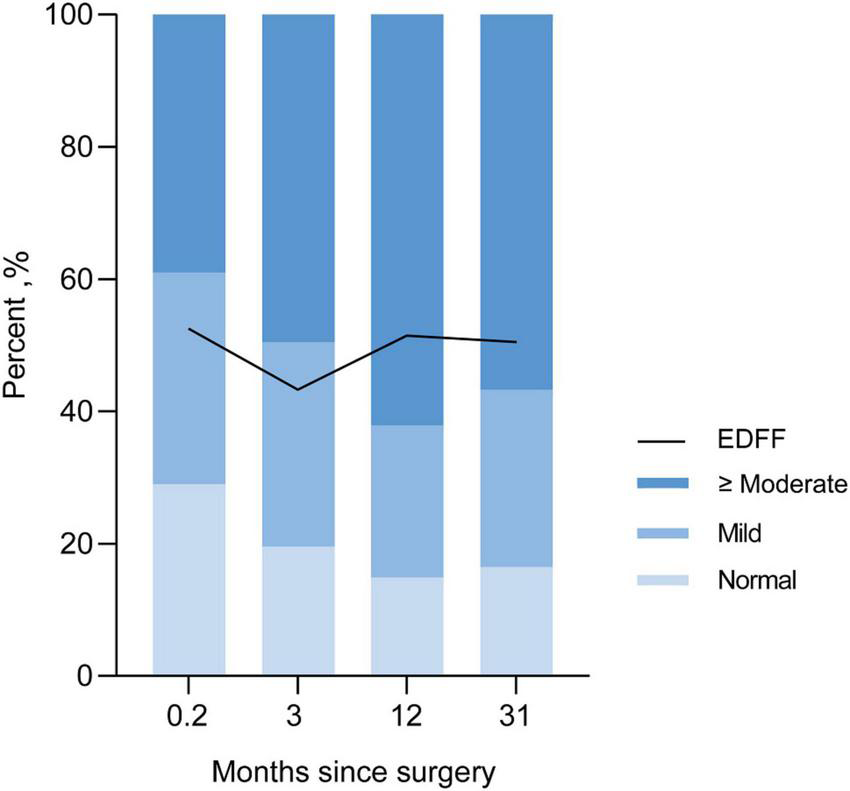Incidence of EDFF and rate of different severity of pulmonary regurgitation in postoperative and follow-up echocardiography. EDFF, end-diastolic forward flow.