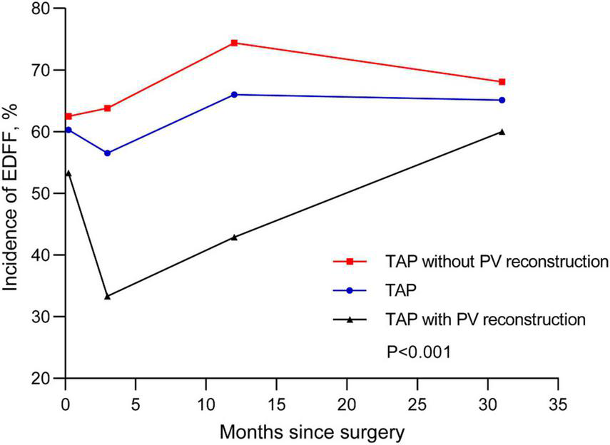 We recorded three follow-ups with a median time of 3, 12, and 31 months, respectively. The incidence of EDFF was 52, 43.3, 52.1, and 49.5% at discharge, the fist, the second, and the last follow-up, respectively. The rate of pulmonary regurgitation (PR) above moderate degree was 39, 49.5, 62.2, and 56.7% in above four periods, respectively (Figure 3 and Table 3). Patients with PV dilatation had a lower incidence of postoperative EDFF than surgically corrected patients during follow-up (P < 0.001). For patients with TAP, the incidence of EDFF was 60.3, 56.5, 66.0, and 66.1% at discharge, the fist, the second, and the last follow-up, respectively. Among the patients with TAP, the incidence of EDFF in those without PV reconstruction was 62.5, 63.8, 74.4, and 68.1% at above four periods, respectively (Figure 4). For patients with monocusp valve reconstructions, the incidence of EDFF was 53.8, 30.8, 33.3, and 61.5% at above four periods, respectively. For two patients with bicuspid valve reconstructions, one always had EDFF from the postoperative to follow-up period and another one only appeared EDFF at the second follow-up.